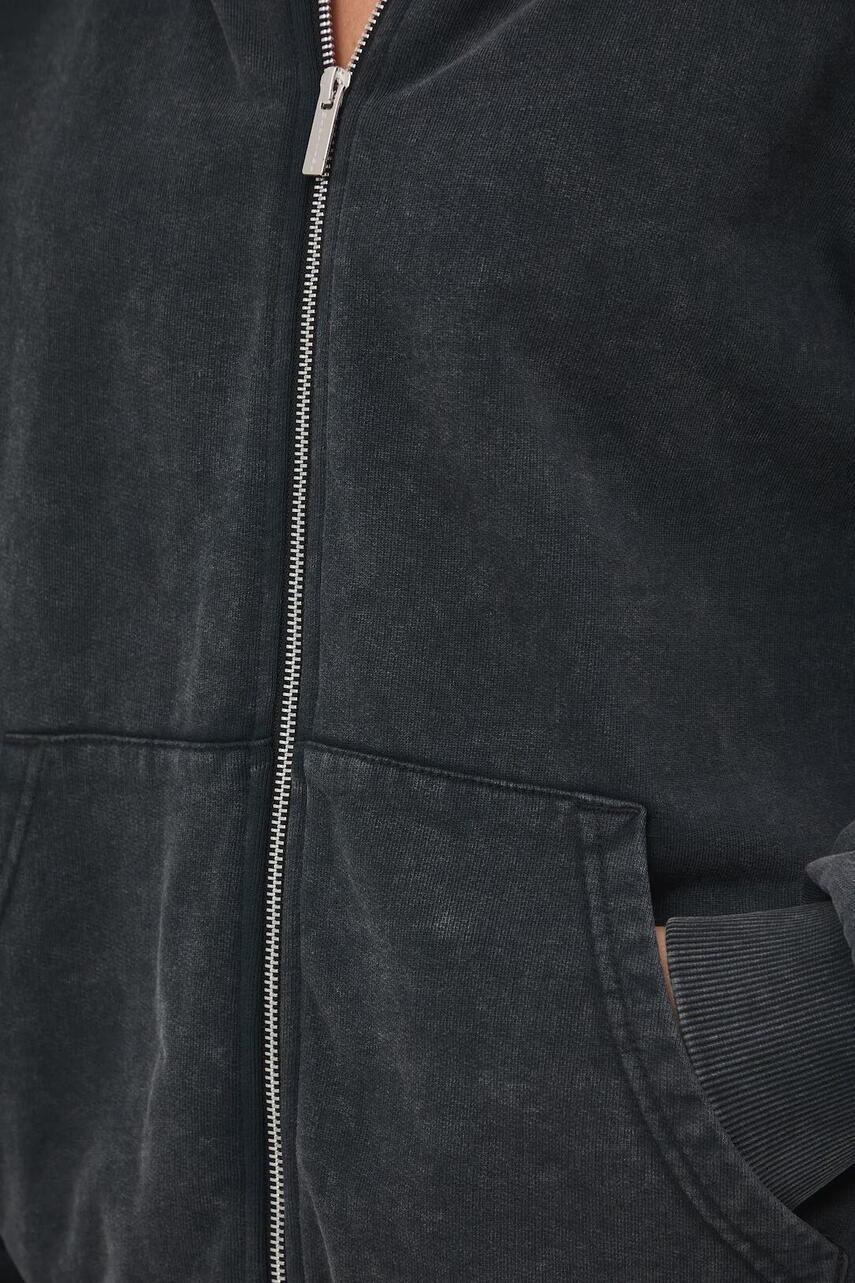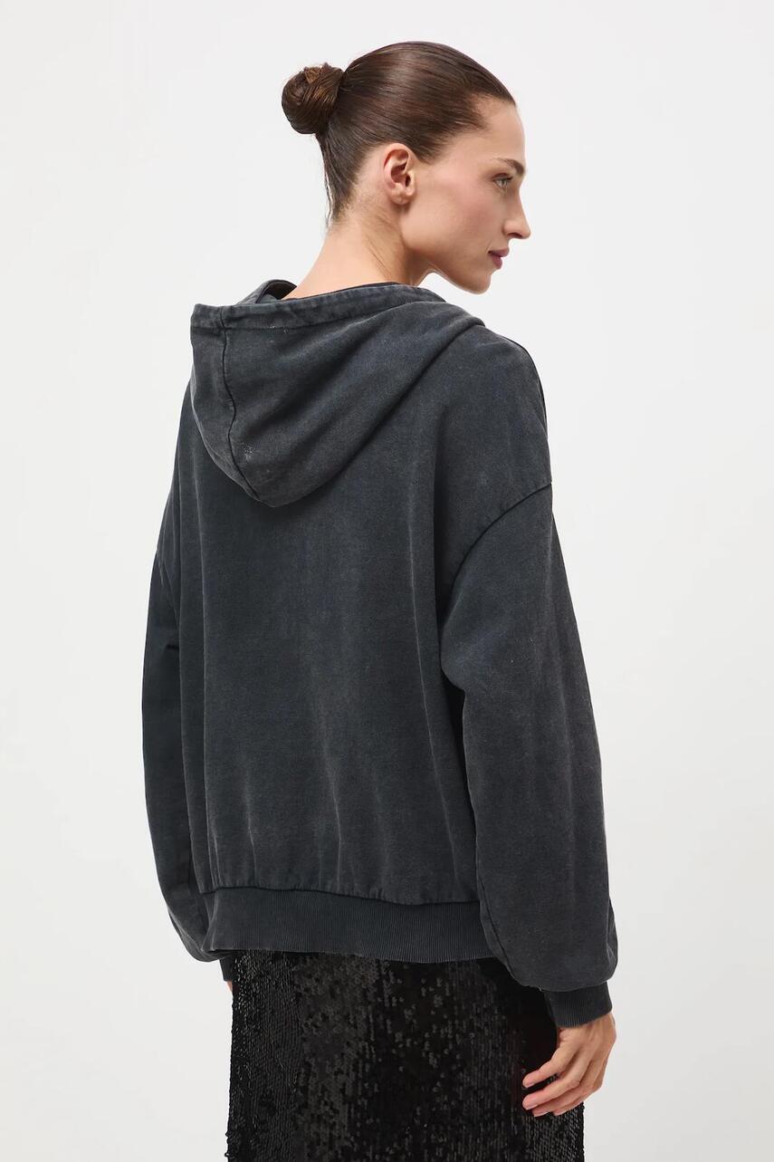 Крій oversize. - Довгий рукав. - Занижена лінія плечей. - Модель з капюшоном. - Застібається на блискавку. - Дві прорізні бічні кишені. - Оздоблення у вигляді стяжки. - Тканина з ефектом випраності.
