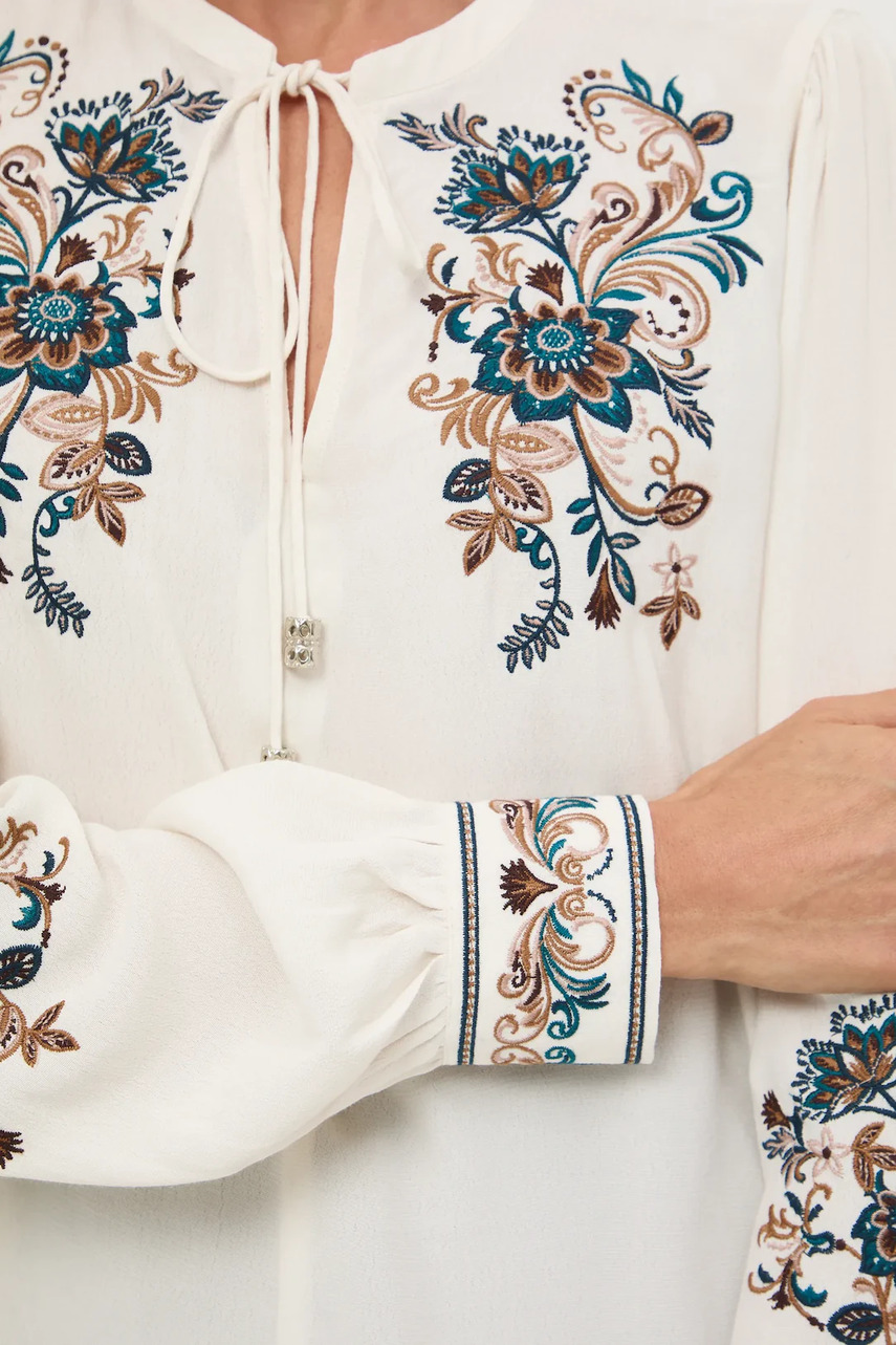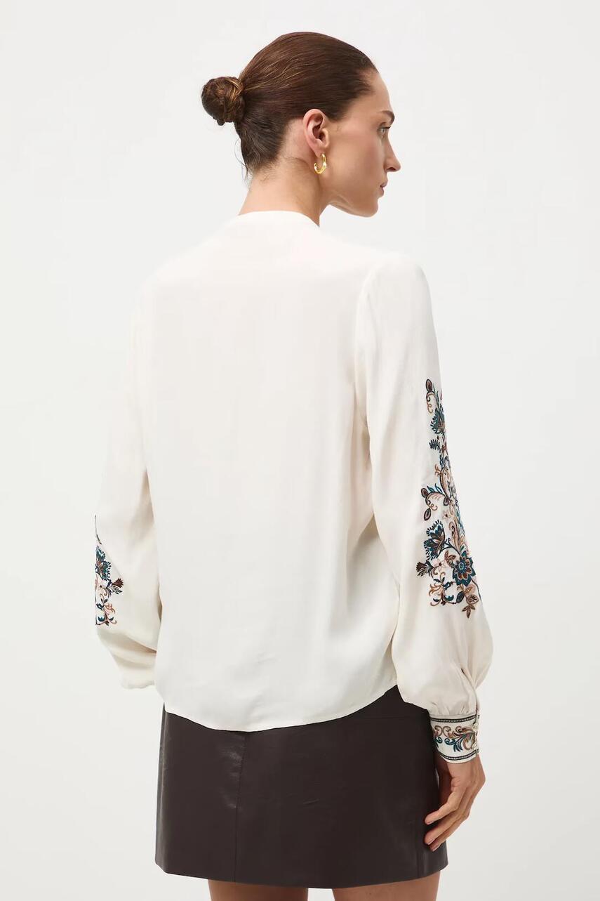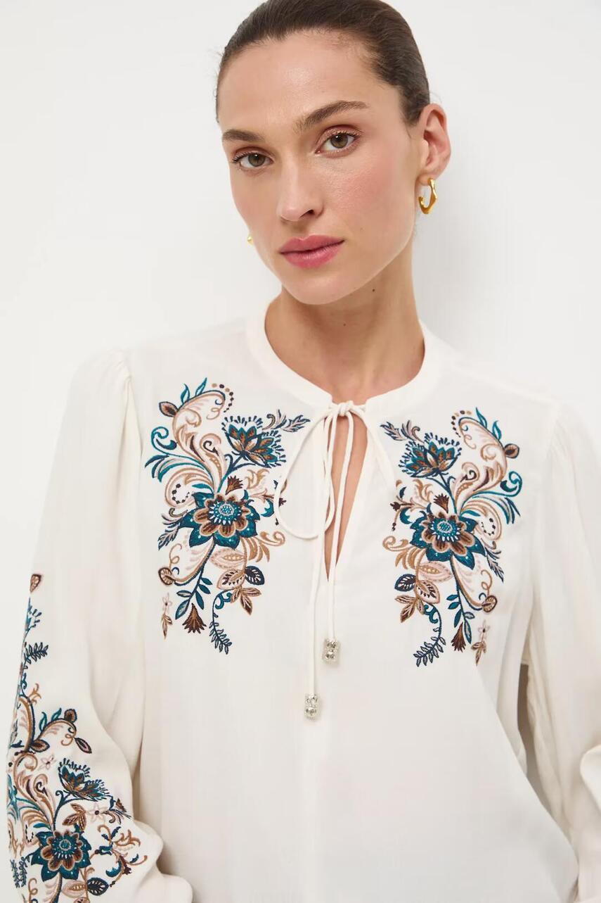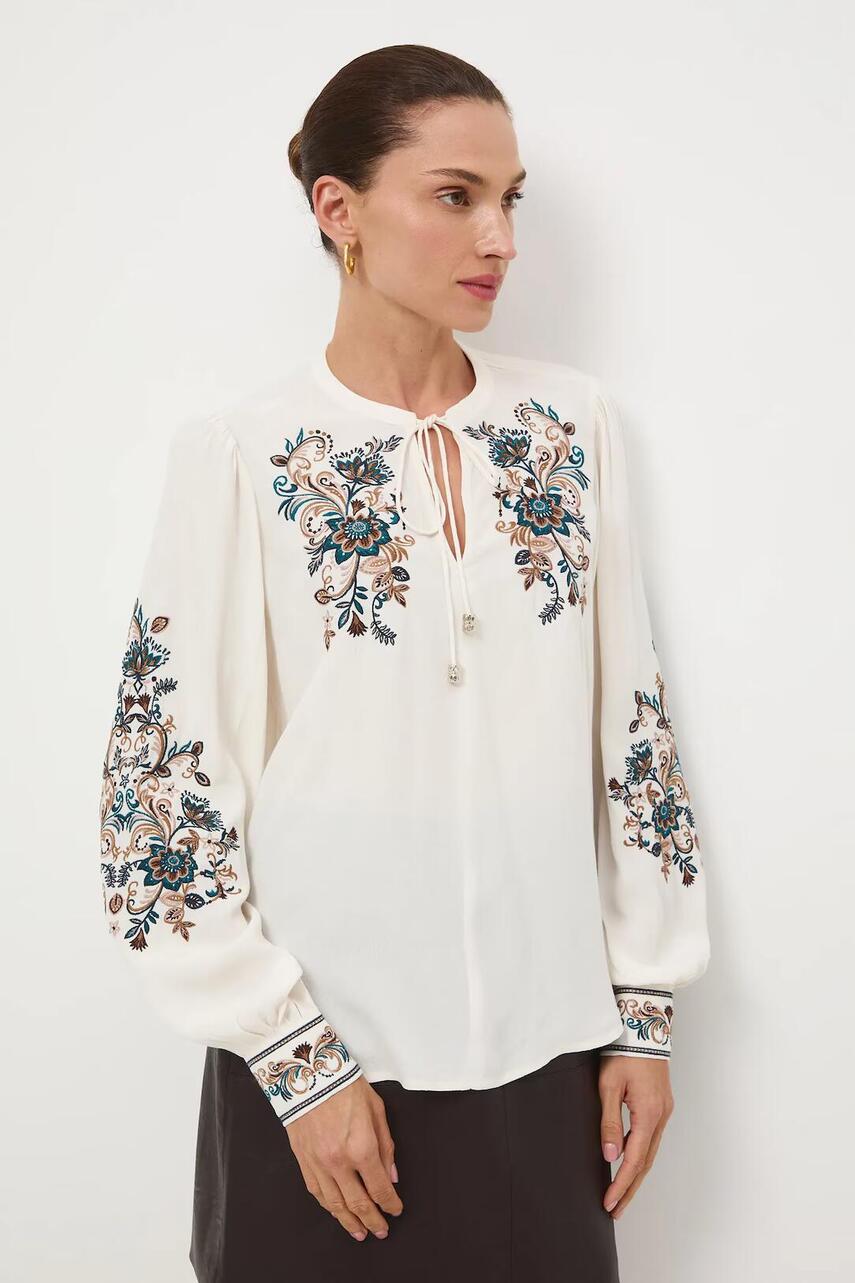 Крій regular. - Довгі, пишні рукави. - Манжети на ґудзиках. - V-подібрний виріз на зав'язці. - Модель із вишивкою. - Декоративні деталі.