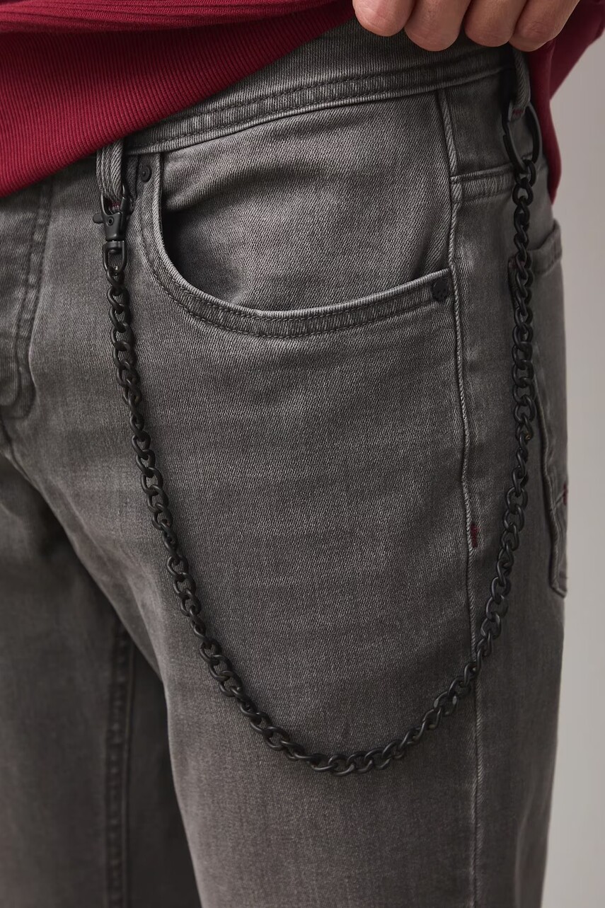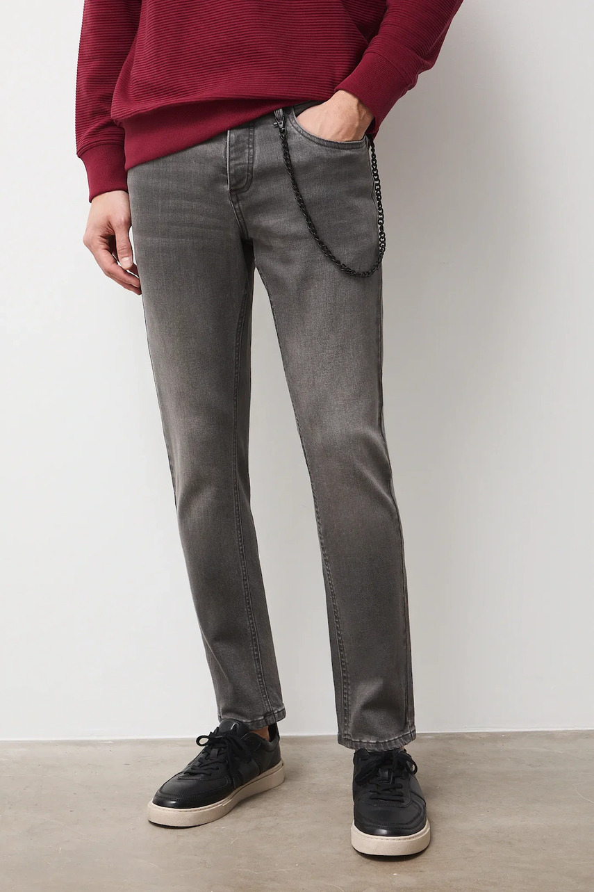 Модель з регулярною талією та застібкою на ґудзики і блискавку. - Прорізні кишені. - Декоративний ланцюжок із застібкою-карабіном йде у комплекті. - Денім з ефектом "прання".