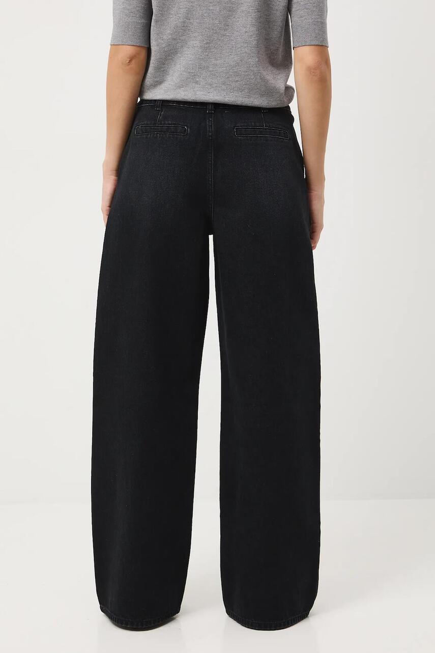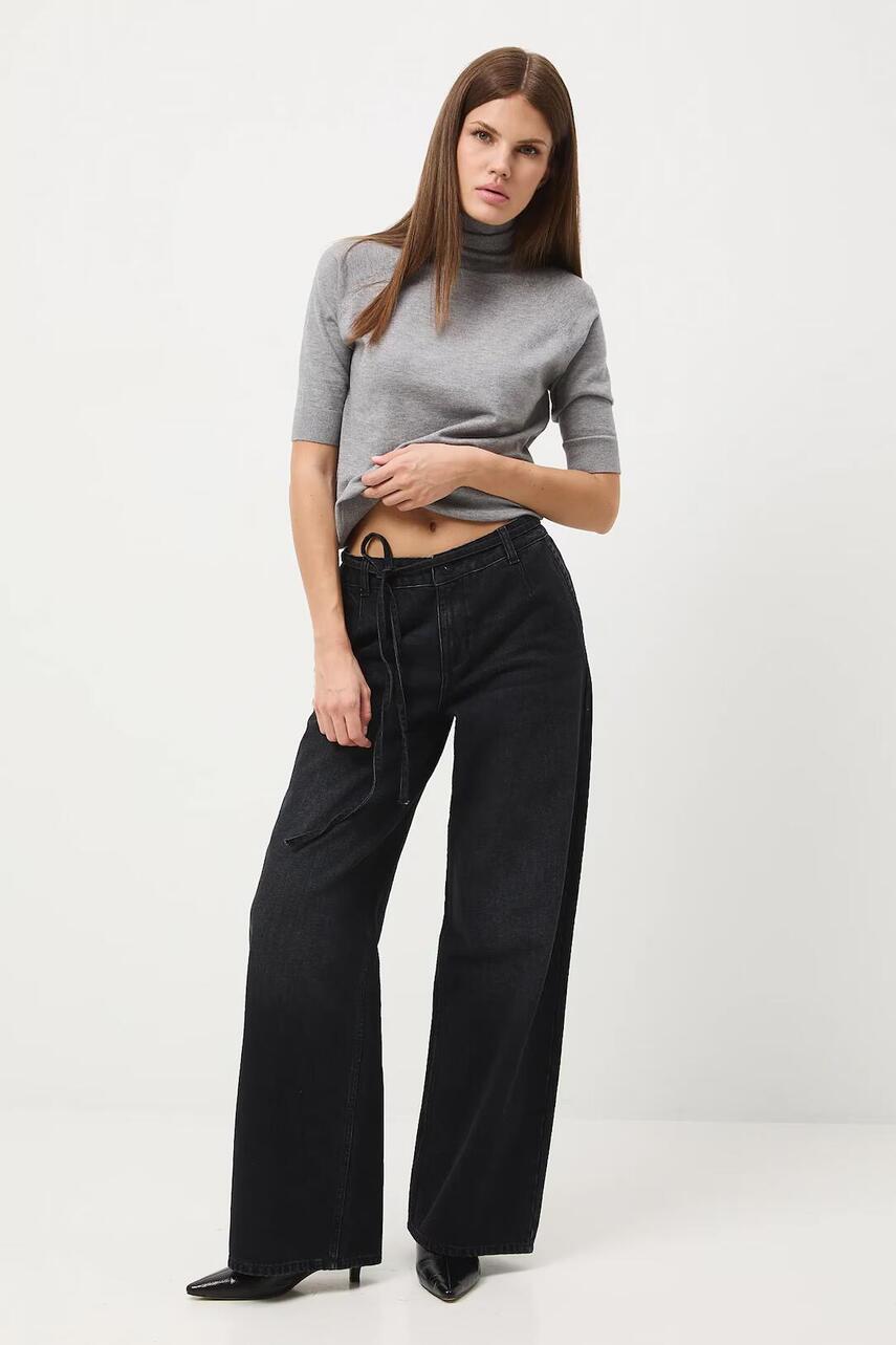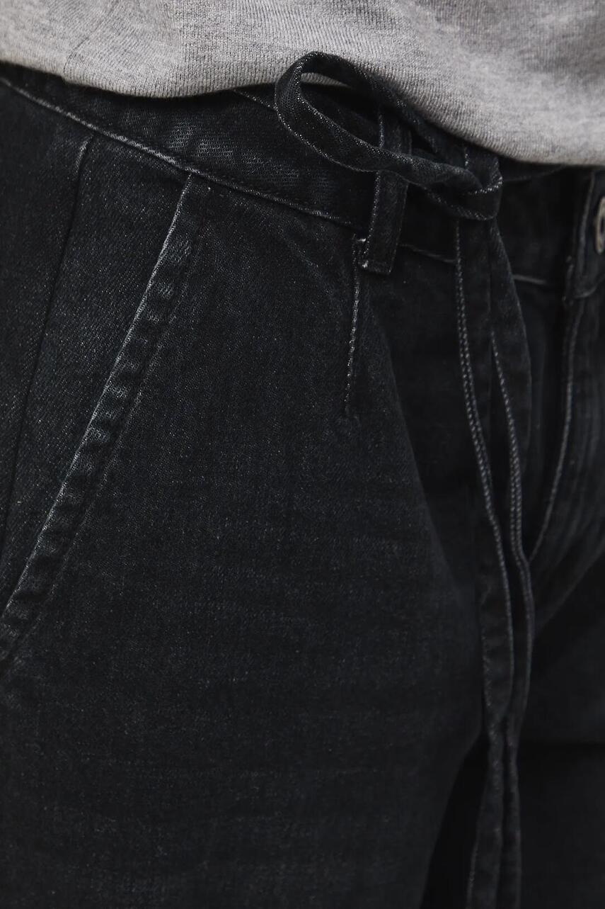 Модель із регулярною талією та застібкою на ґудзики і блискавку. - У поясі - зав'язка. - Прорізні кишені. - Широка штанина. - Денім з ефектом випраності.