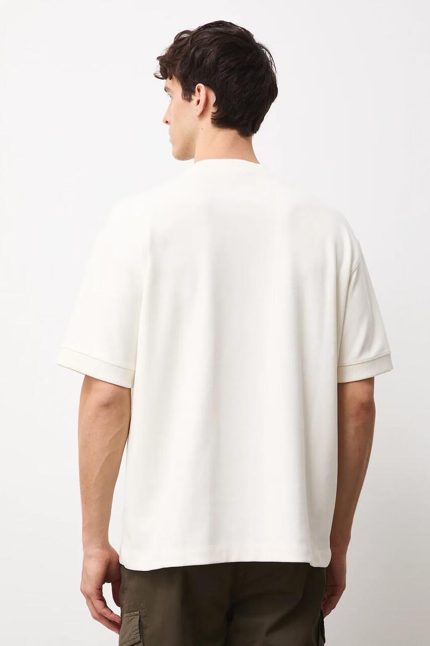 Фасон relaxed. - Короткий рукав. - Занижена лінія плечей. - Круглий, ребристий виріз. - Рукава зі стяжкою. - Трикотаж interlock щільного переплетення. - Гладкий трикотаж.