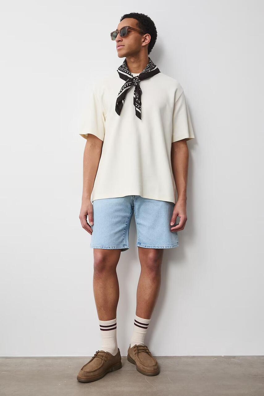 Вільний фасон. - Короткий рукав. - Круглий, ребристий виріз. - Фактурний матеріал.