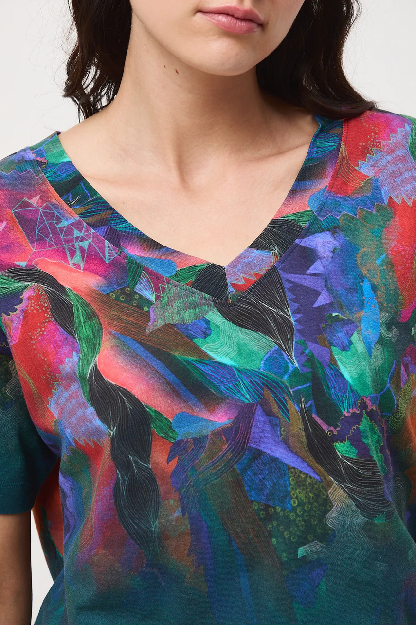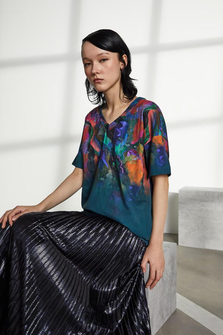 Крій oversize. - Короткий рукав. - Занижена лінія плечей. - V-подібний виріз. - Модель з принтом.
