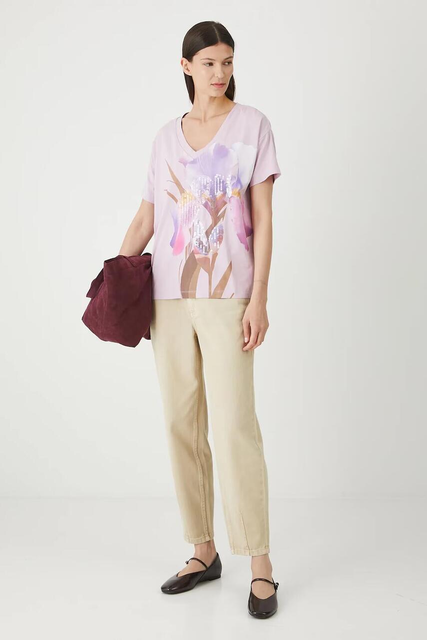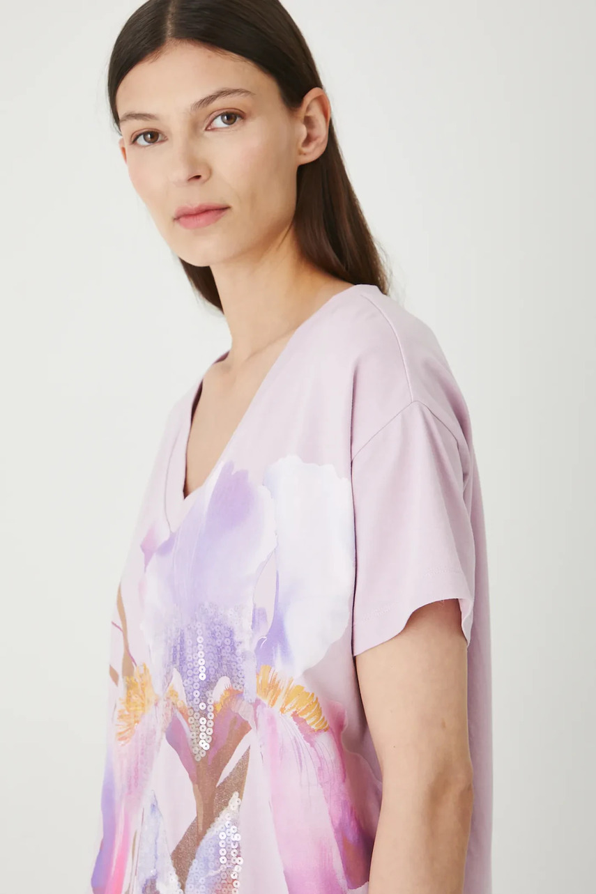 Крій regular. - Короткий рукав. - V-подібний виріз. - Модель з принтом. - Модель з декоративною аплікацією з паєток.
