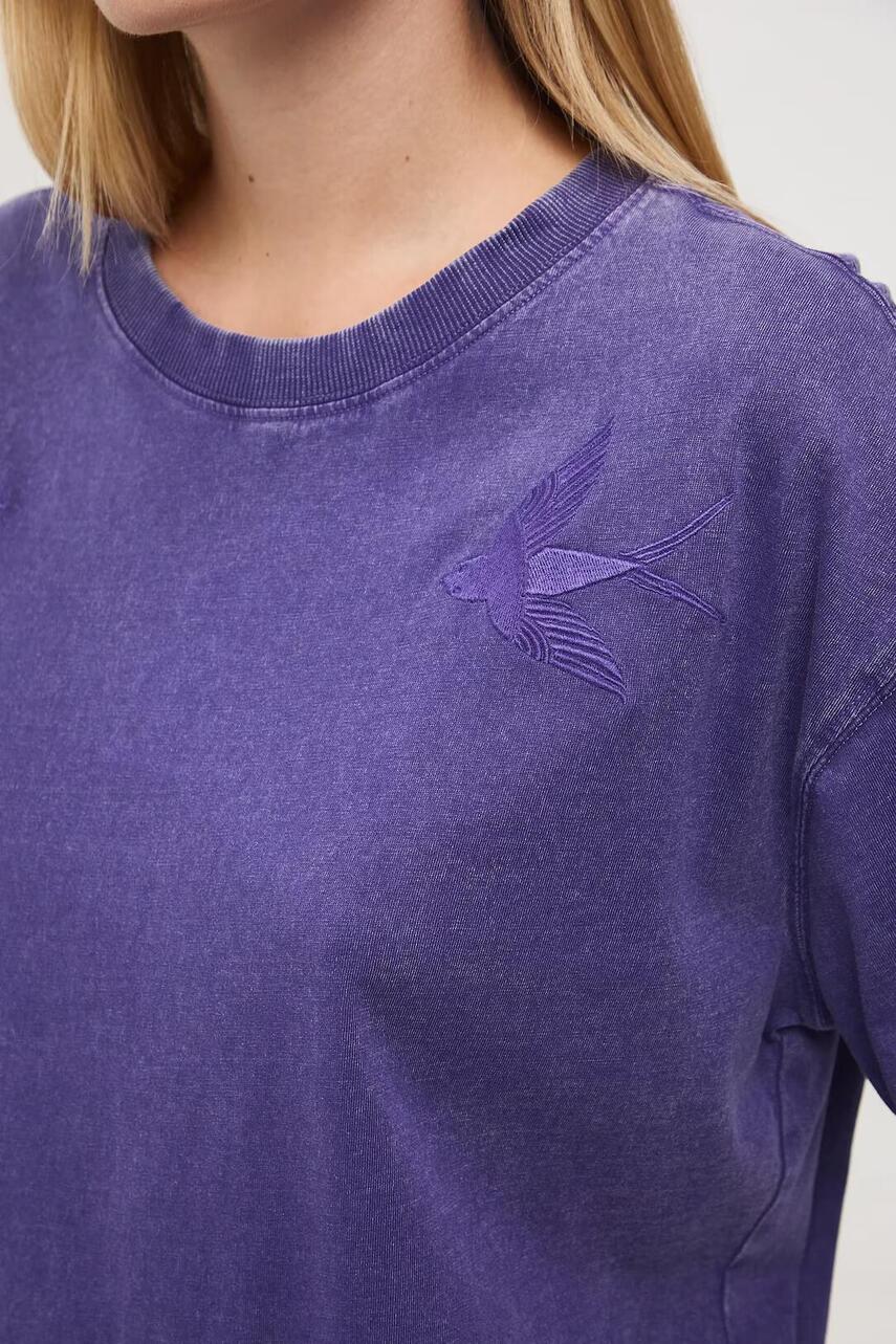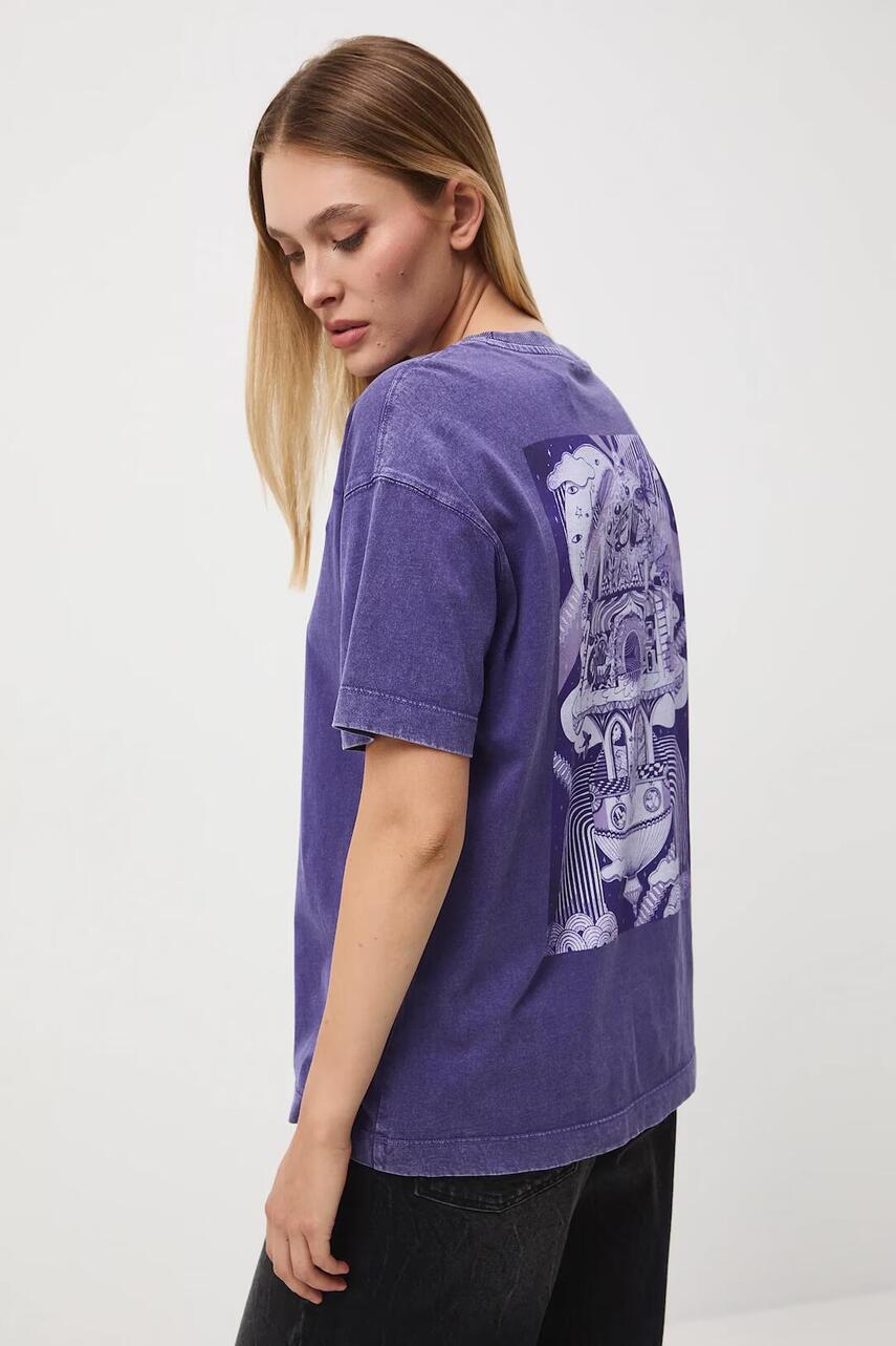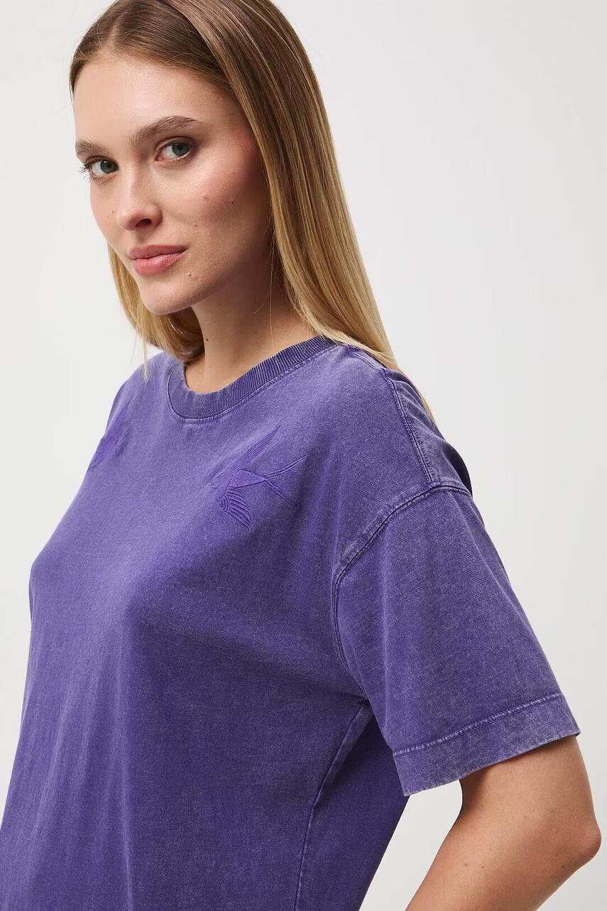Крій oversize. - Короткий рукав. - Занижена лінія плечей. - Круглий, ребристий виріз. - Модель з принтом на спині. - Модель з декоративною вишивкою. - Тканина з ефектом випраності.