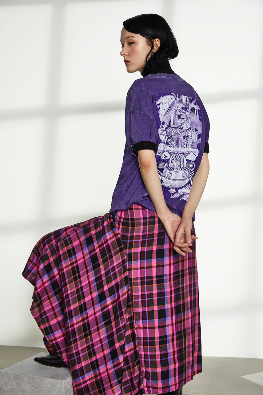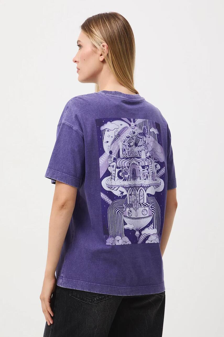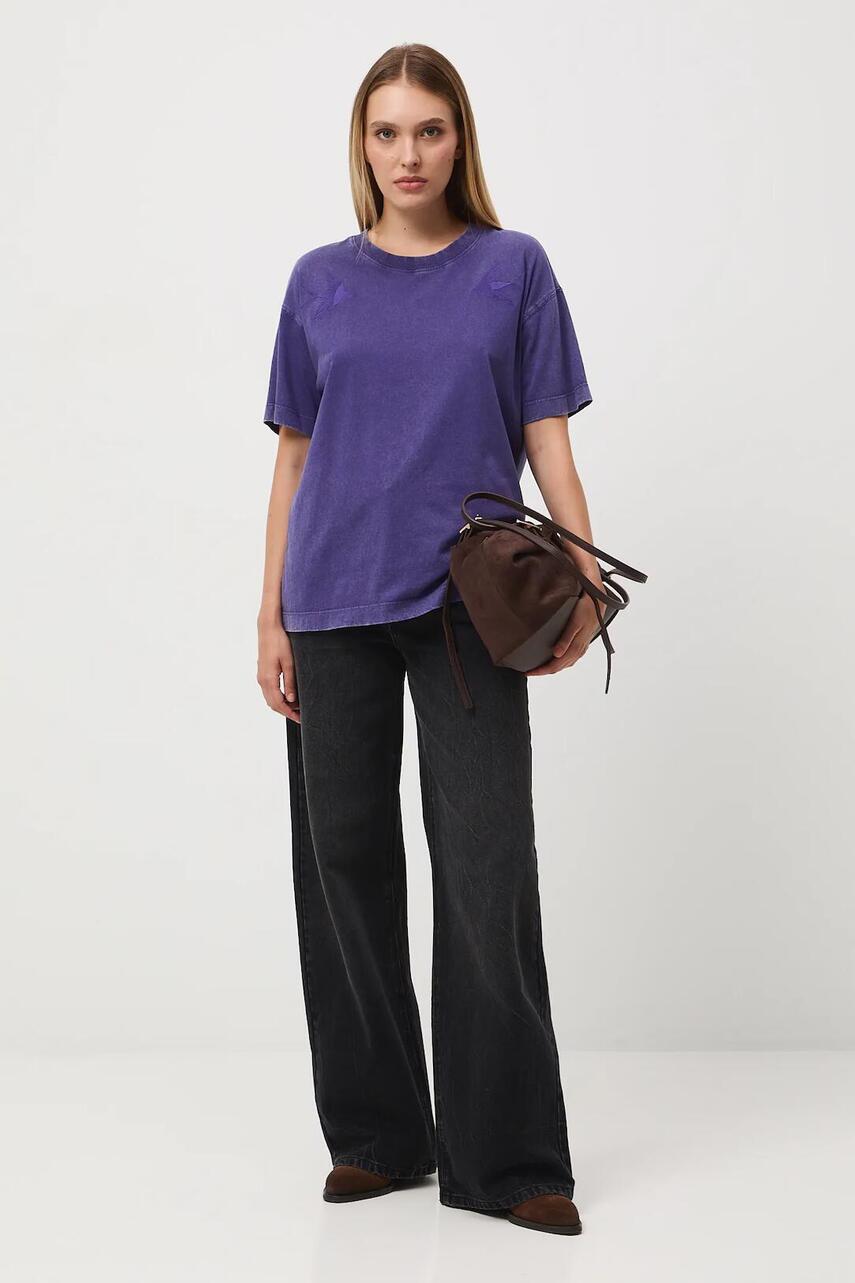 Крій oversize. - Короткий рукав. - Занижена лінія плечей. - Круглий, ребристий виріз. - Модель з принтом на спині. - Модель з декоративною вишивкою. - Тканина з ефектом випраності.