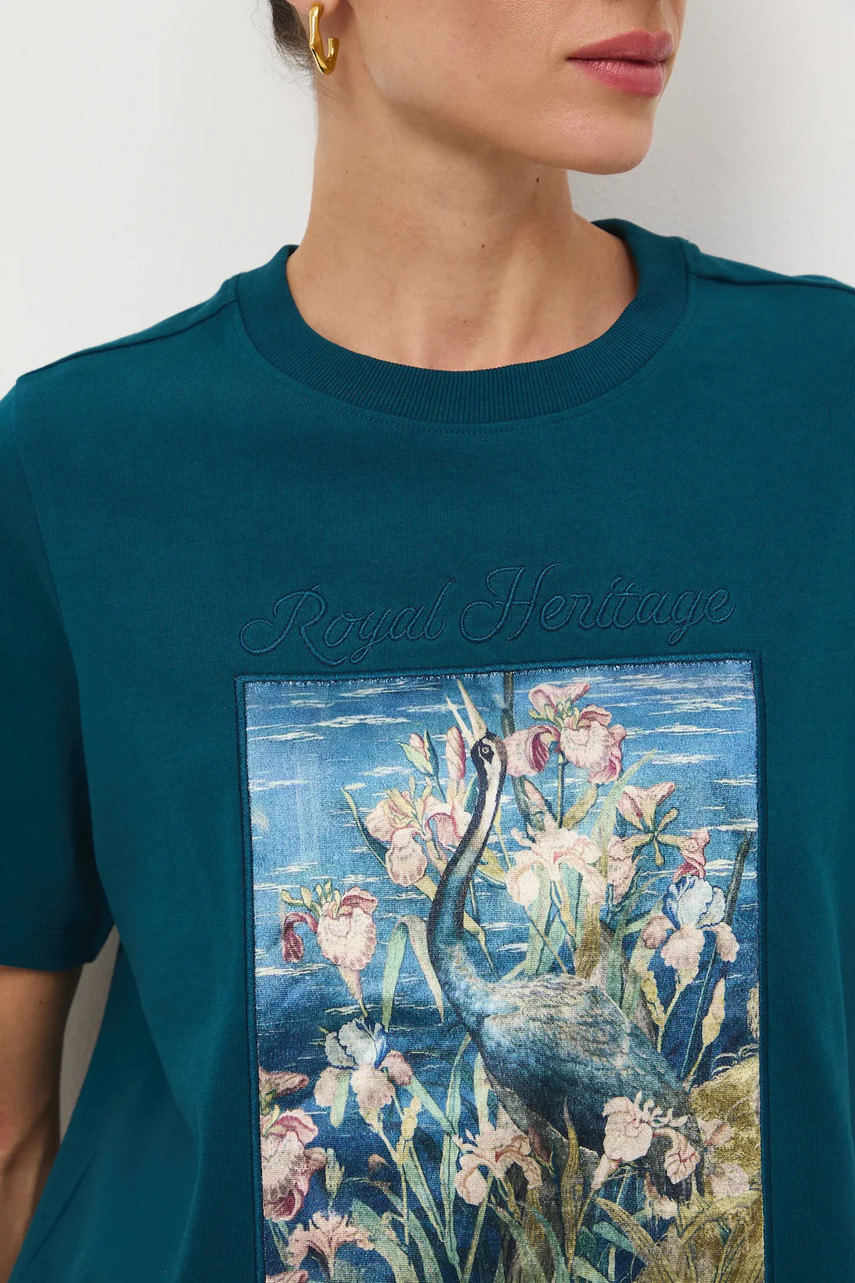 Крій regular. - Короткий рукав. - Круглий виріз. - Модель з декоративною аплікацією. - Спереду вишивка з написом: Royal Heritage. - Модель з принтом на спині. - Трикотаж heavy weight з більш грубим, щільним переплетенням.