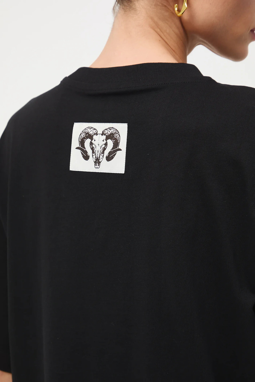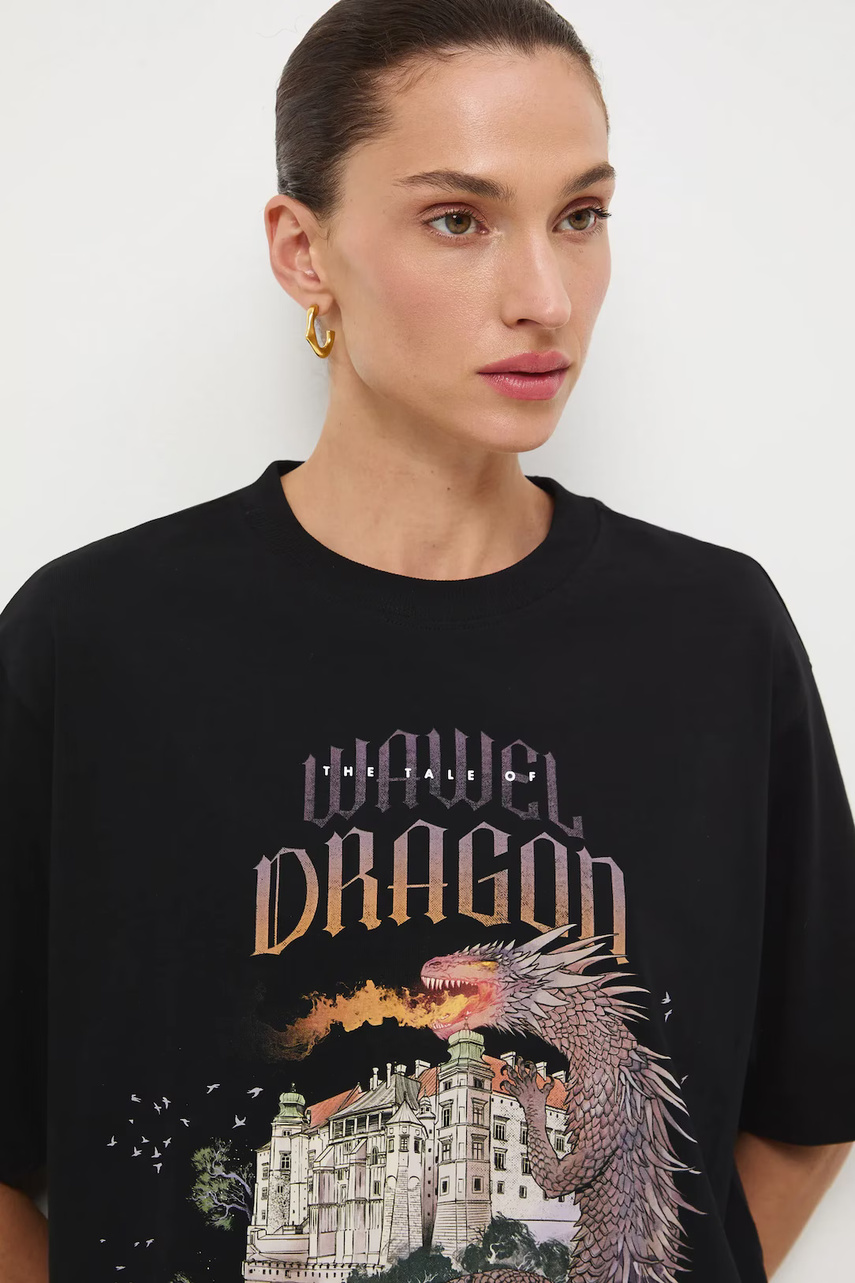 Крій oversize. - Короткий рукав. - Занижена лінія плечей. - Круглий виріз. - Модель з принтом. - Принт з написом: The tale of Wawel Dragon. - Декоративна нашивка.
