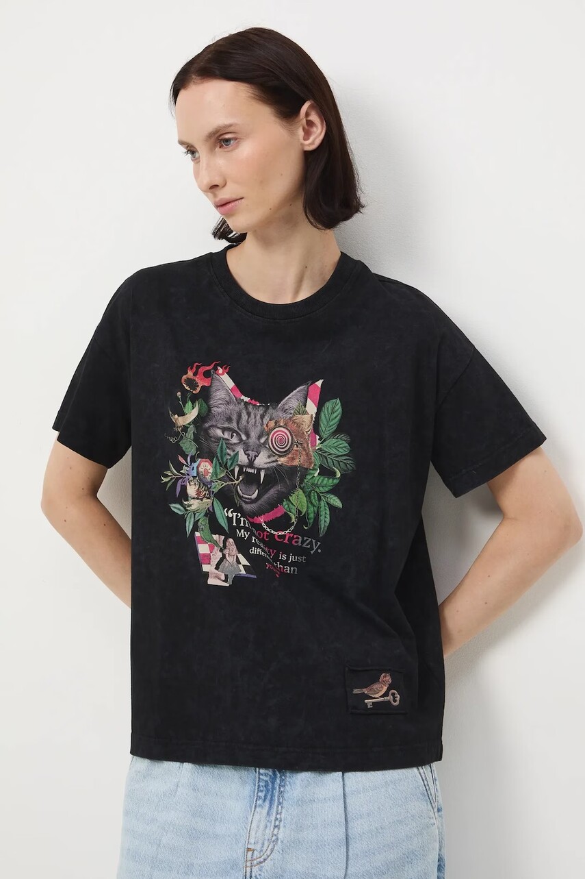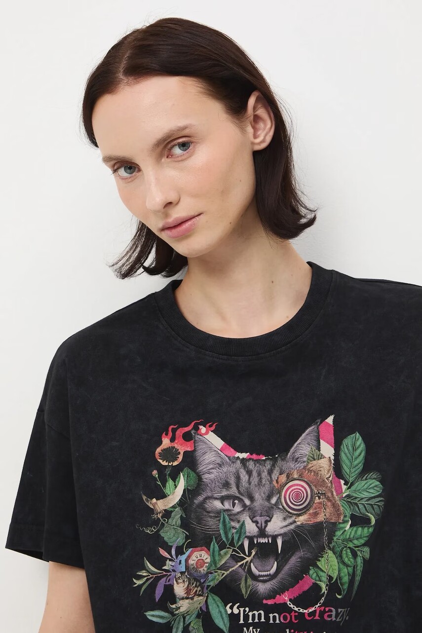 Крій oversize. - Короткий рукав. - Занижена лінія плечей. - Круглий, ребристий виріз. - Модель з принтом на грудях та спині. - На передній частині надрукований текст: "I'm not crazy. My reality is just different than yours." - Декоративна нашивка. - Тканина з ефектом випраності.