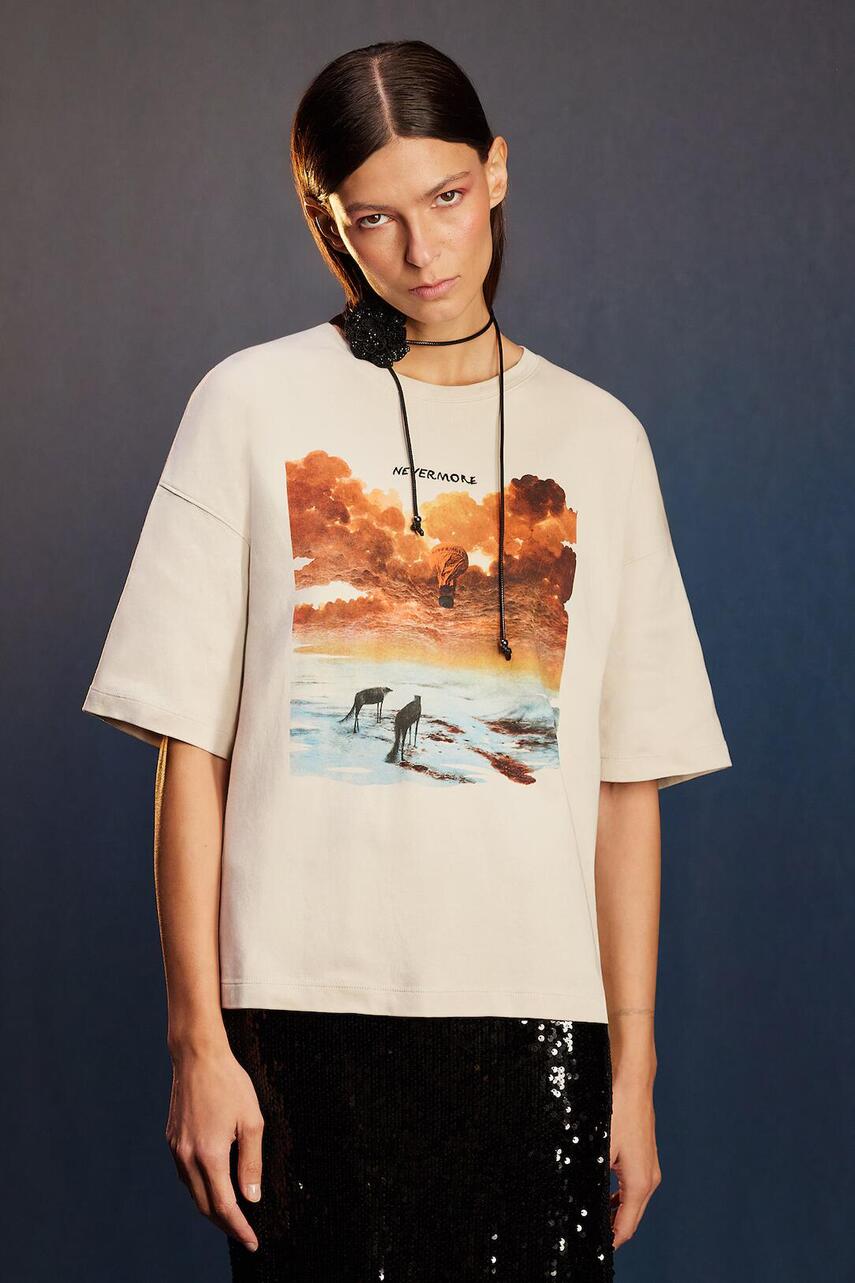 Крій oversize. - Короткий рукав. - Занижена лінія плечей. - Круглий виріз. - Модель з принтом на грудях та спині. - Модель із вишивкою. - Бавовняний трикотаж interlock зі щільним переплетенням.