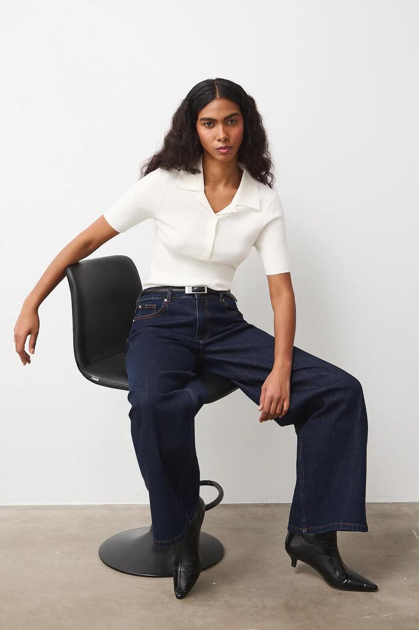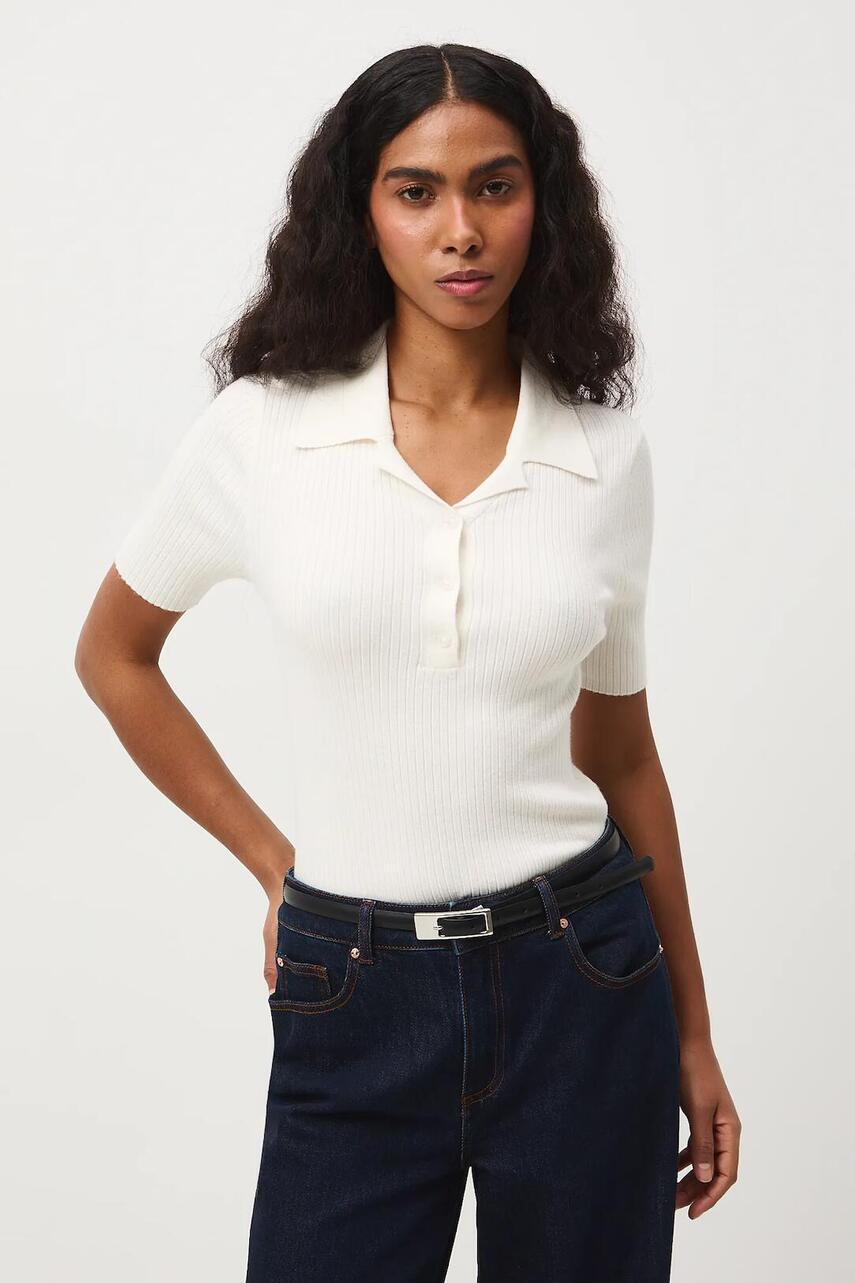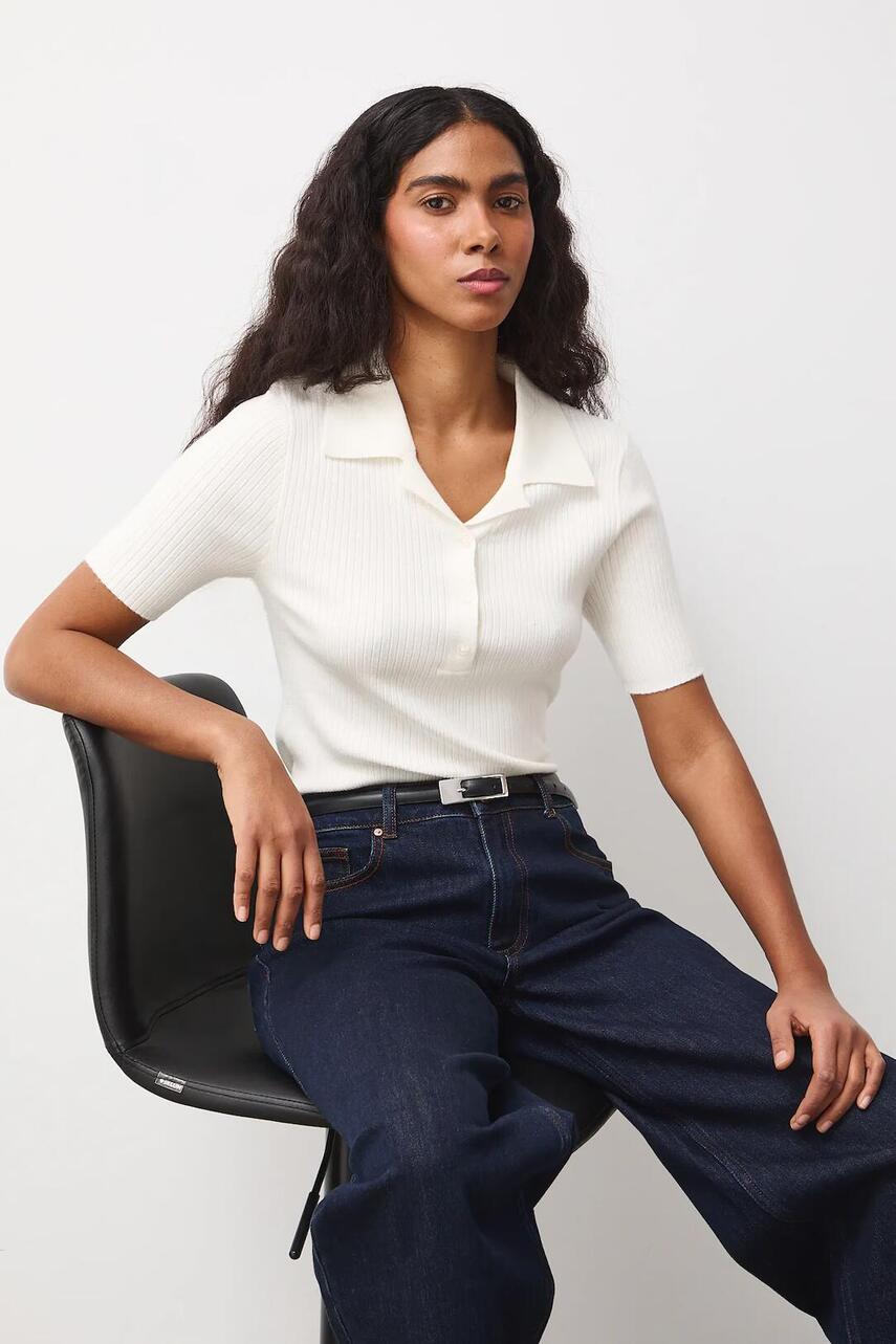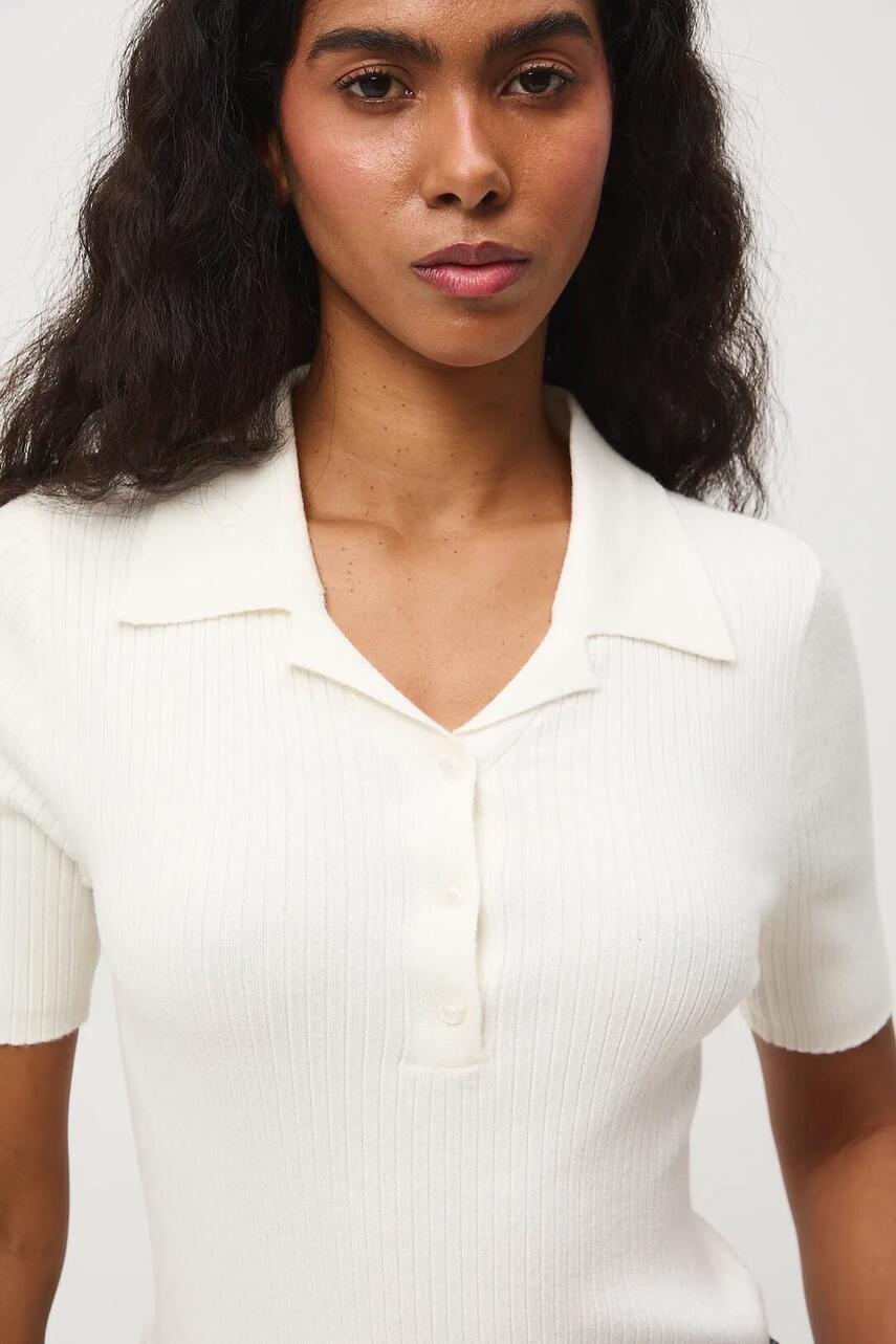 Крій slim. - Короткий рукав. - Модель з коміром. - Коротка застібка на ґудзиках. - Трикотаж в рубчик.