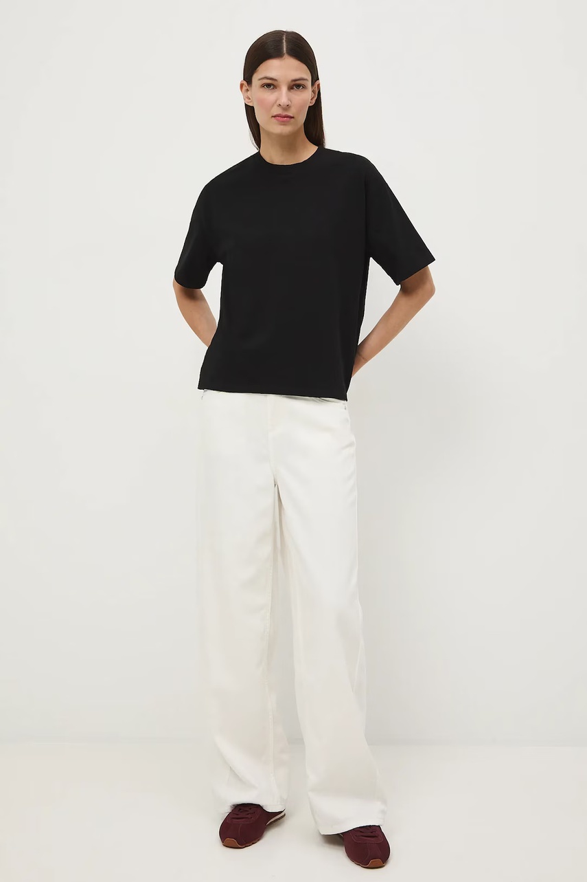 Крій oversize. - Короткий рукав. - Занижена лінія плечей. - Круглий виріз. - Декоративне прострочування. - Гладкий трикотаж. - Трикотаж heavy weight з більш грубим, щільним переплетенням.