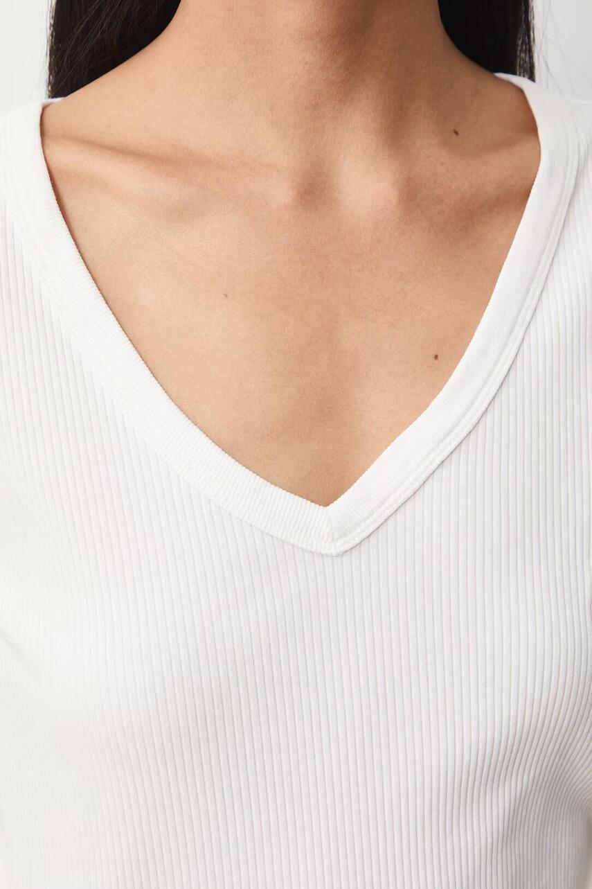 Крій slim. - Короткий рукав. - V-подібний виріз. - Трикотаж в рубчик.