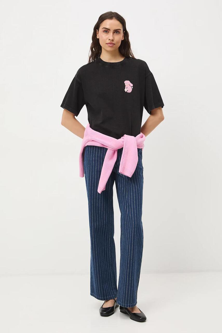 Крій oversize. - Опущена лінія плеча. - Круглий виріз. - Тканина типу heavy weight зі щільнішим плетінням. - Модель з принтом.