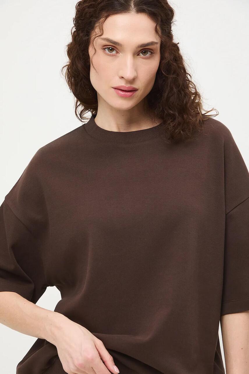 Крій oversize. - Короткий рукав. - Занижена лінія плечей. - Нижній край оброблений зручною еластичною стрічкою. - Гладкий трикотаж. - Бавовняний трикотаж interlock зі щільним переплетенням.