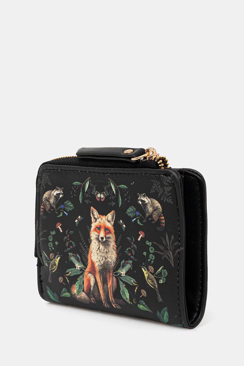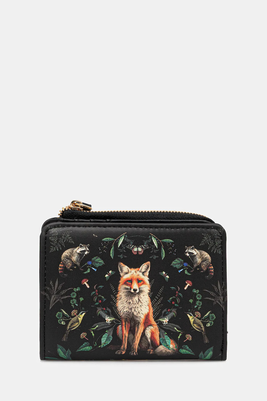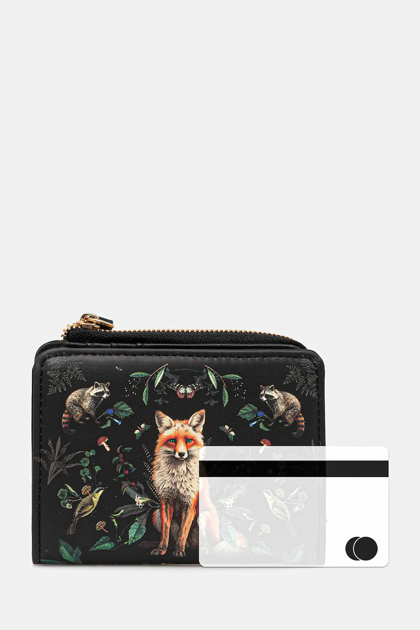 Застібка на кнопку. - Відсіки для карт. - Відділення для банкнот. - Кишеня для монет застібається на блискавку. - Дизайн з квітковими та тваринними мотивами. - Матове покриття.