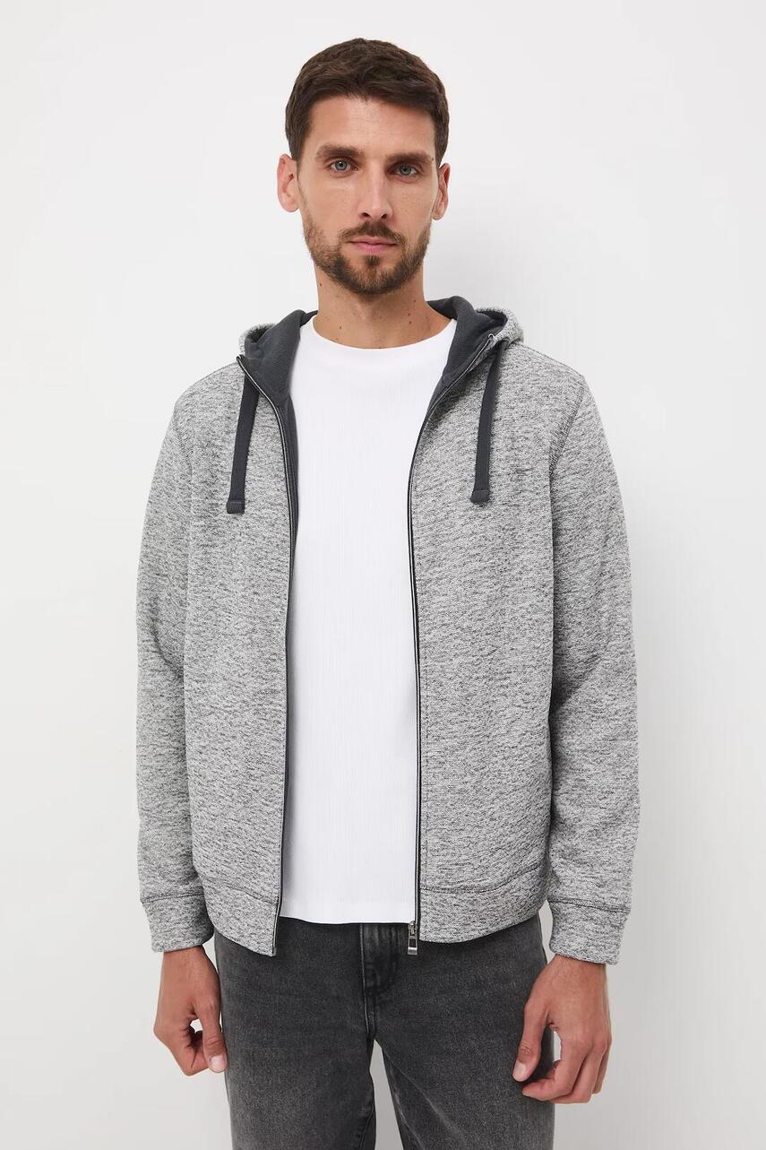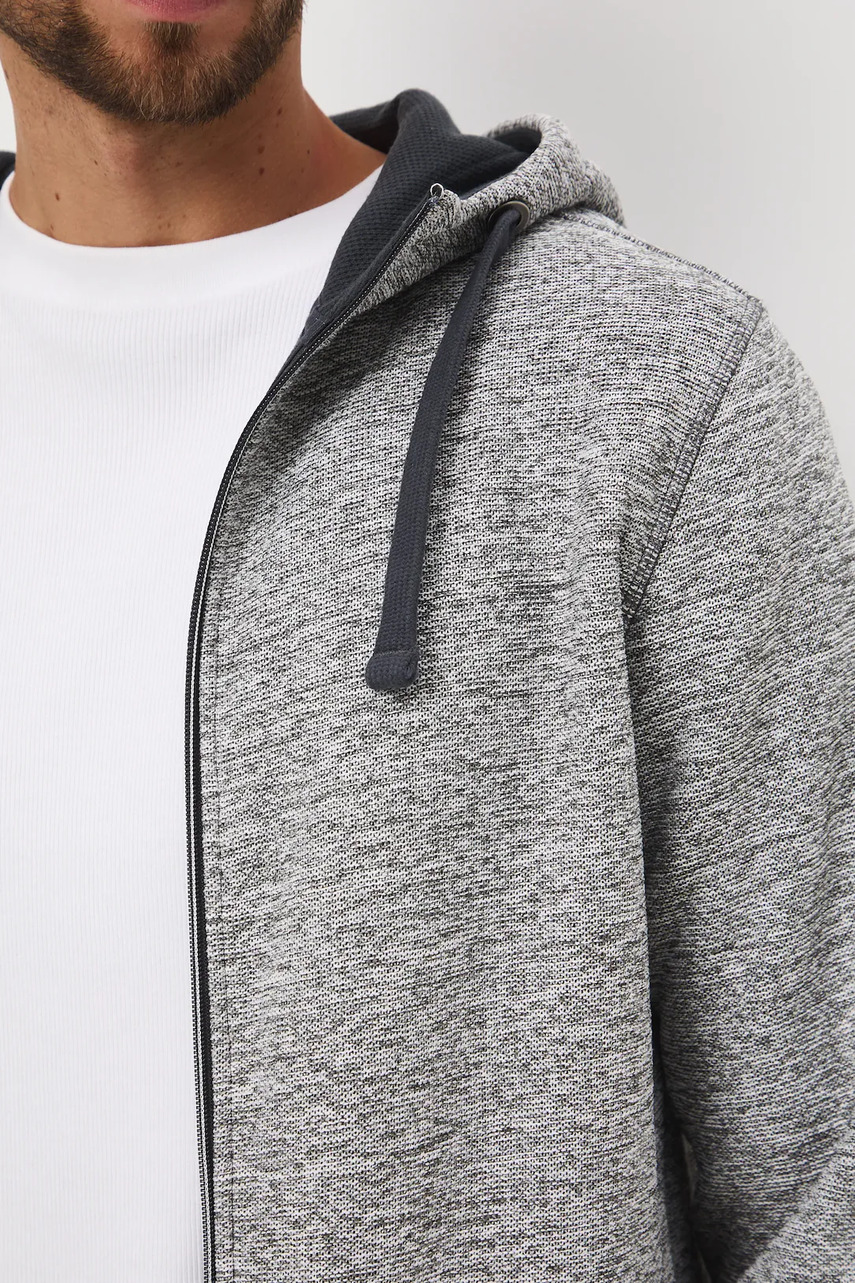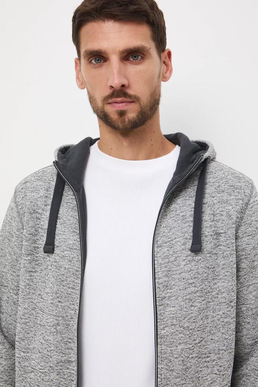 Крій regular. - Довгий рукав. - Капюшон зі стягуванням. - Застібається на блискавку. - Дві прорізні бічні кишені. - Оздоблення у вигляді стяжки. - Трикотаж меланж.