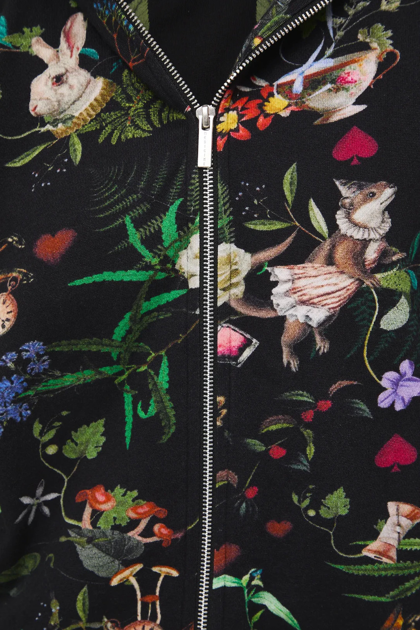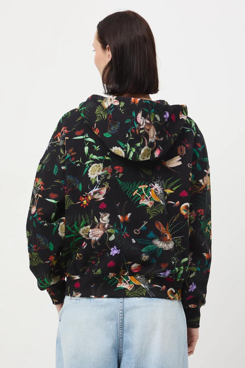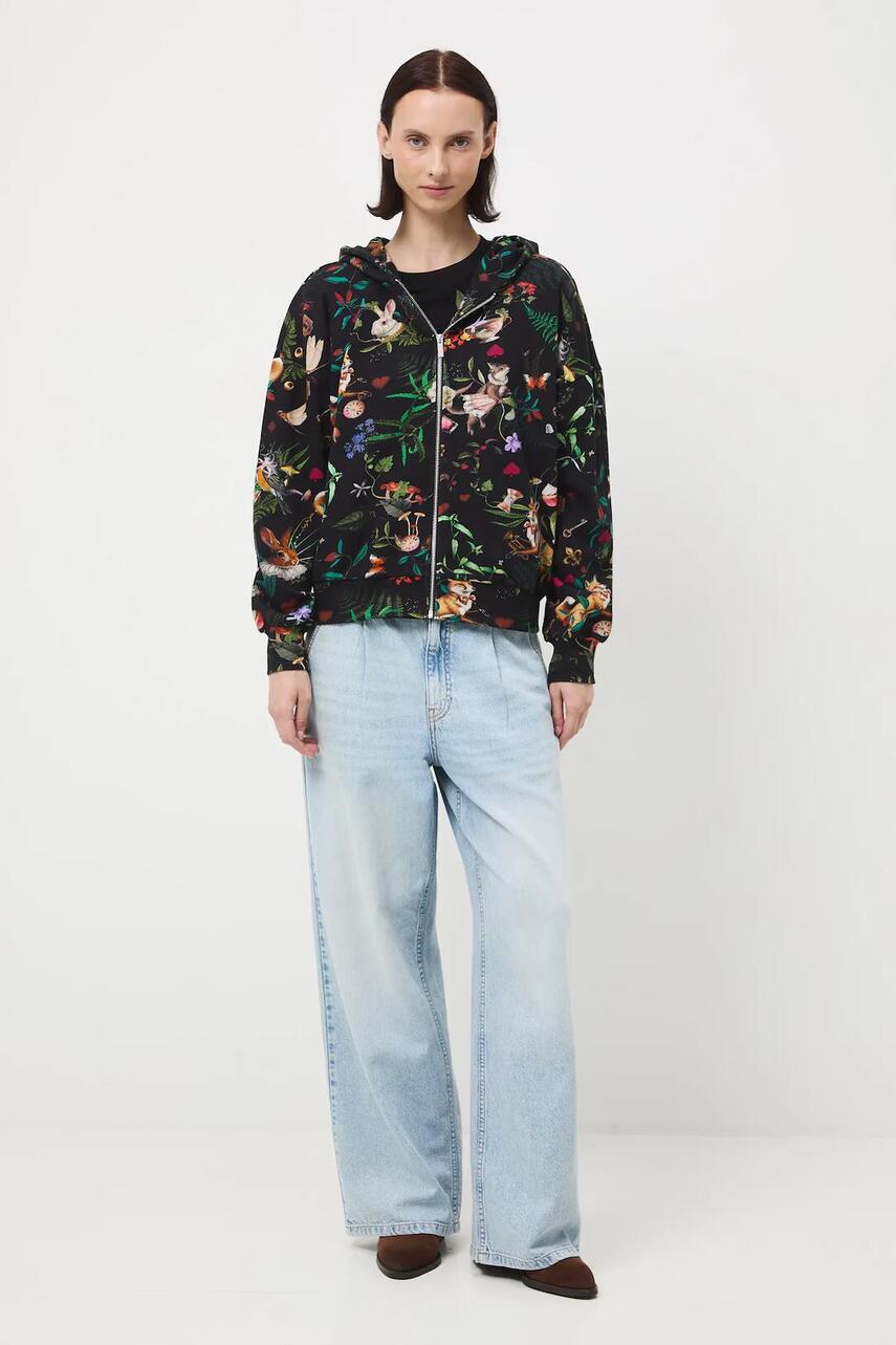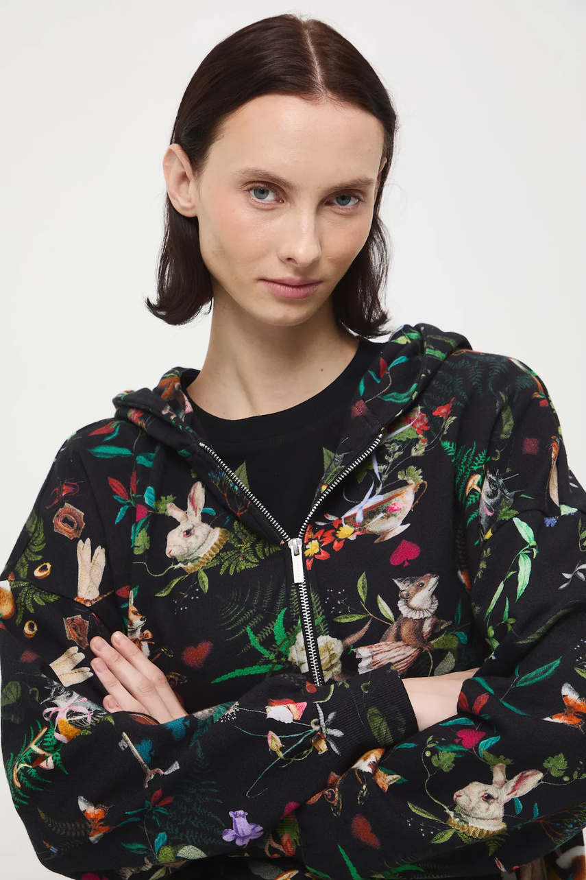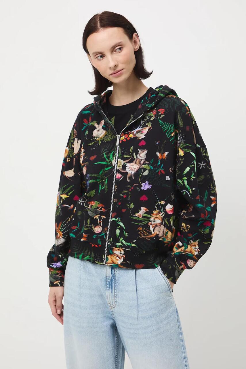 Крій oversize. - Довгий рукав. - Занижена лінія плечей. - Модель з капюшоном. - Застібається на блискавку. - Оздоблення у вигляді стяжки. - Дизайн з квітковими та тваринними мотивами. - Розташування візерунка може відрізнятися на кожному виробі.