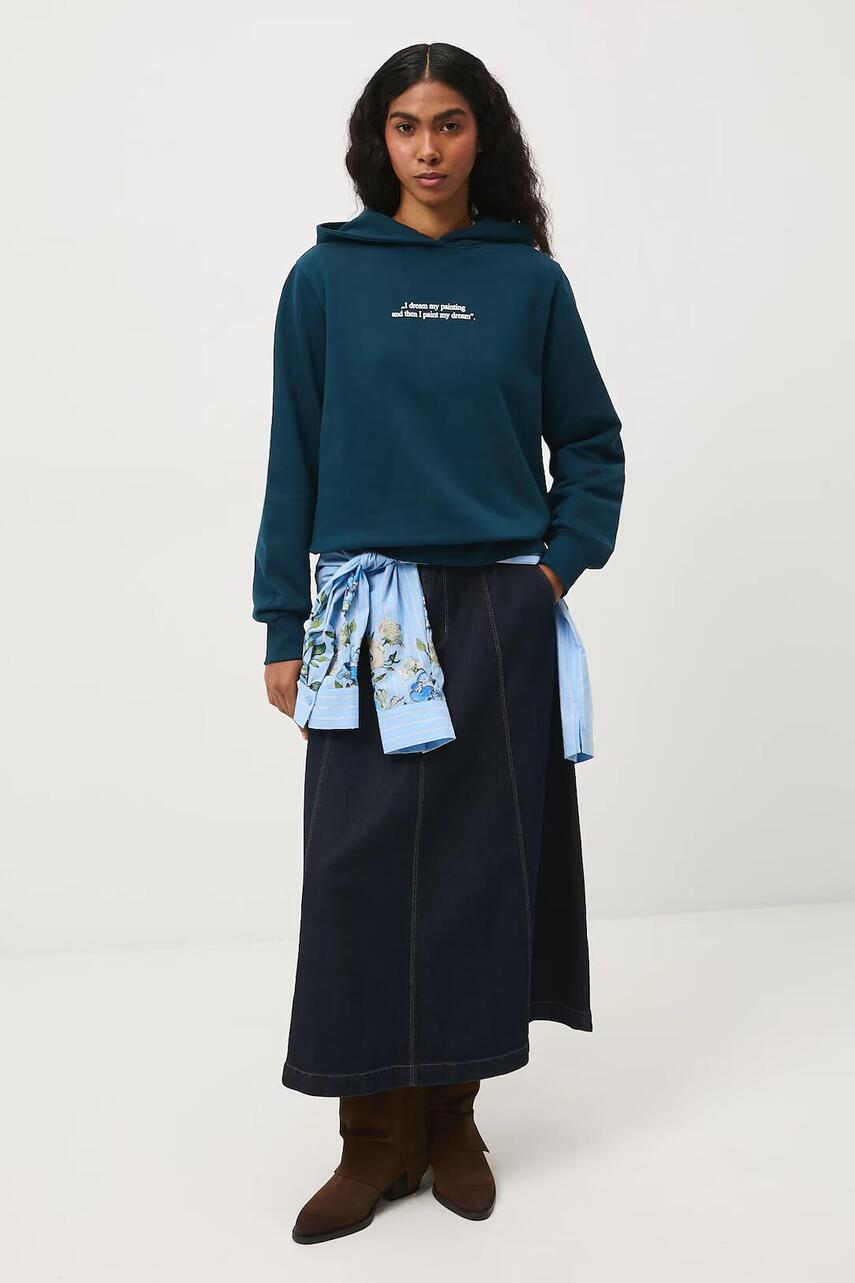 Крій regular. - Довгий рукав. - Модель з капюшоном. - Оздоблення у вигляді стяжки. - Модель з принтом та вишивкою. - На передній частині надрукований текст: „I dream my painting and then I paint my dream.”