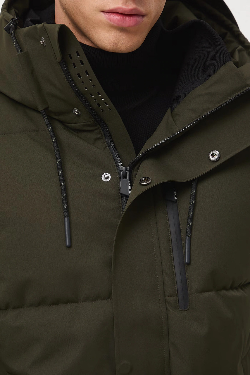 Вітрозахисна модель. - Прямий фасон. - Довгий рукав. - Рукава зі стяжкою. - Застібка на блискавку і кнопки. - Завищений комір із запахом на блискавці. - Капюшон зі стягуванням. - Нагрудна кишеня на блискавці. - Внутрішня кишеня на блискавці. - Прорізна внутрішня кишеня. - Нижній край оброблений зав'язками зі стопорами, які завдяки регульованому подолу підвищують ізоляцію від холоду. - Утеплена модель з підкладкою.