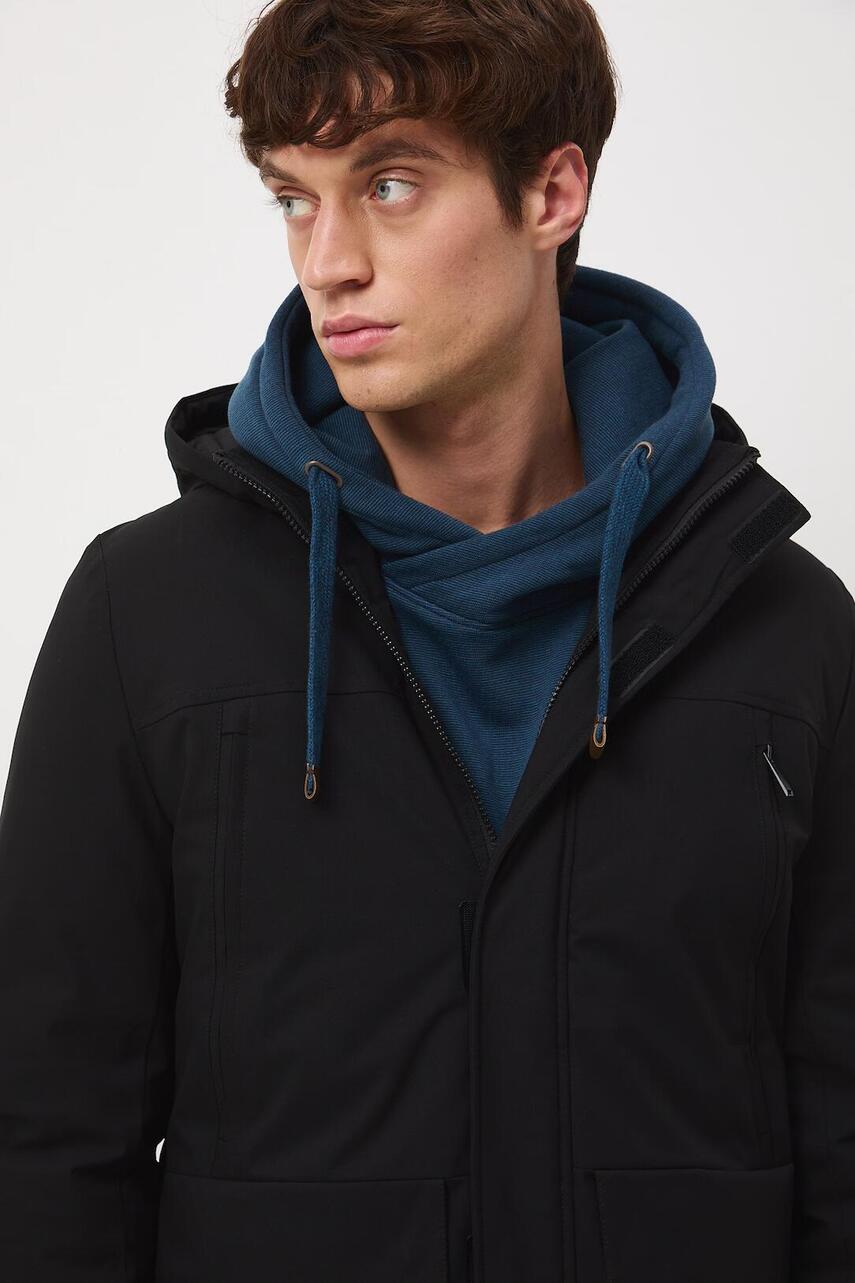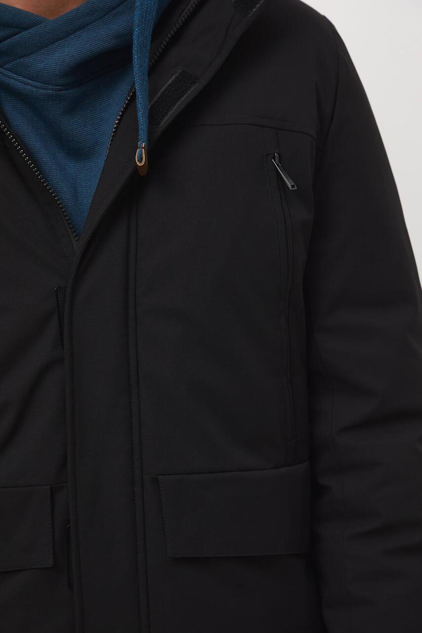Прямий фасон. - Довгий рукав. - Завищений комір. - Зйомний капюшон. - Застібка на липучки та блискавку. - Нижній край має шнурки. - Дві бічні кишені з декоративними нашивками застібаються на кнопки. - Дві нагрудні кишені на блискавці. - Внутрішня кишеня на блискавці. - Легко утеплена модель на підкладці.