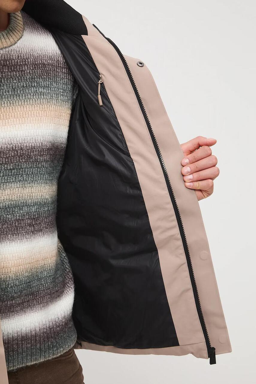 Вітрозахисна модель. - Прямий фасон. - Довгий рукав. - Рукава зі стяжкою. - Застібка на блискавку і кнопки. - Завищений комір із запахом на блискавці. - Капюшон зі стягуванням. - Нагрудна кишеня на блискавці. - Внутрішня кишеня на блискавці. - Прорізна внутрішня кишеня. - Нижній край оброблений зав'язками зі стопорами, які завдяки регульованому подолу підвищують ізоляцію від холоду. - Утеплена модель з підкладкою.