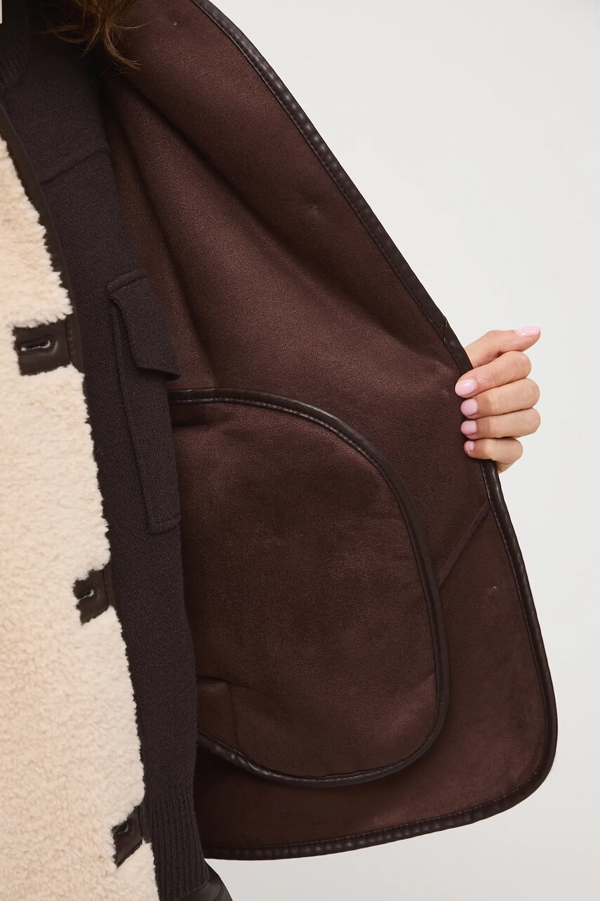 Крій oversize. - Довгий рукав. - Застібається на гудзики. - Завищений комір. - Прорізні кишені. - Декоративне прострочування. - Модель виконана зі штучного хутра.