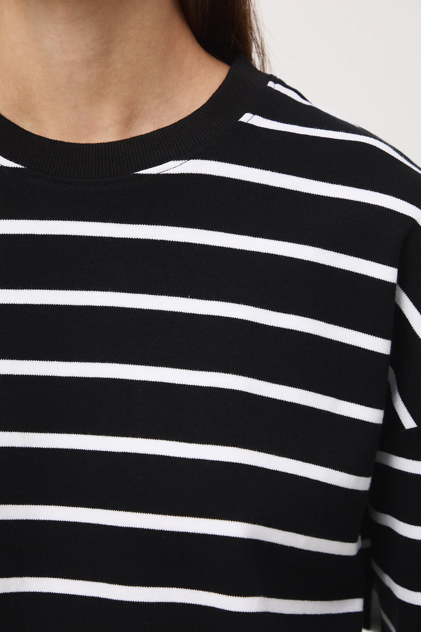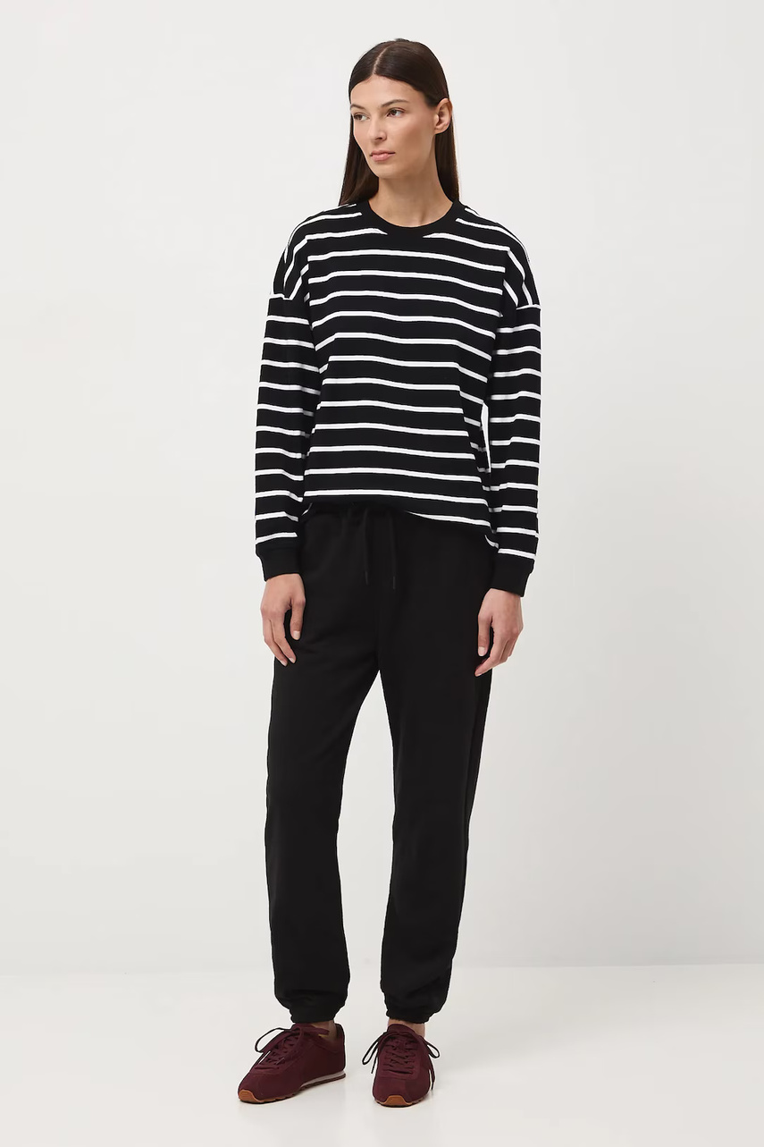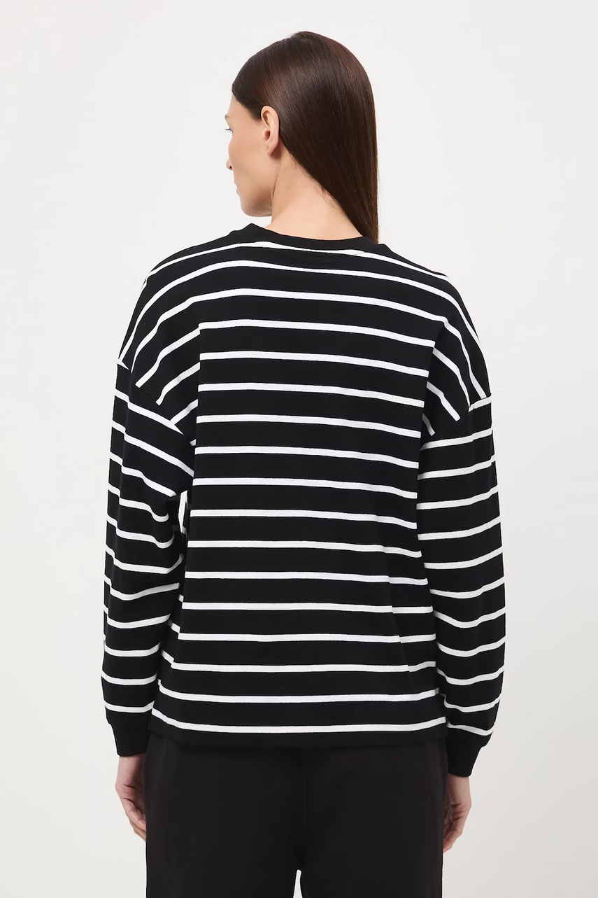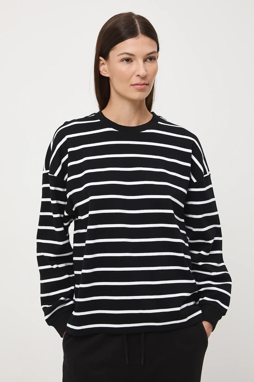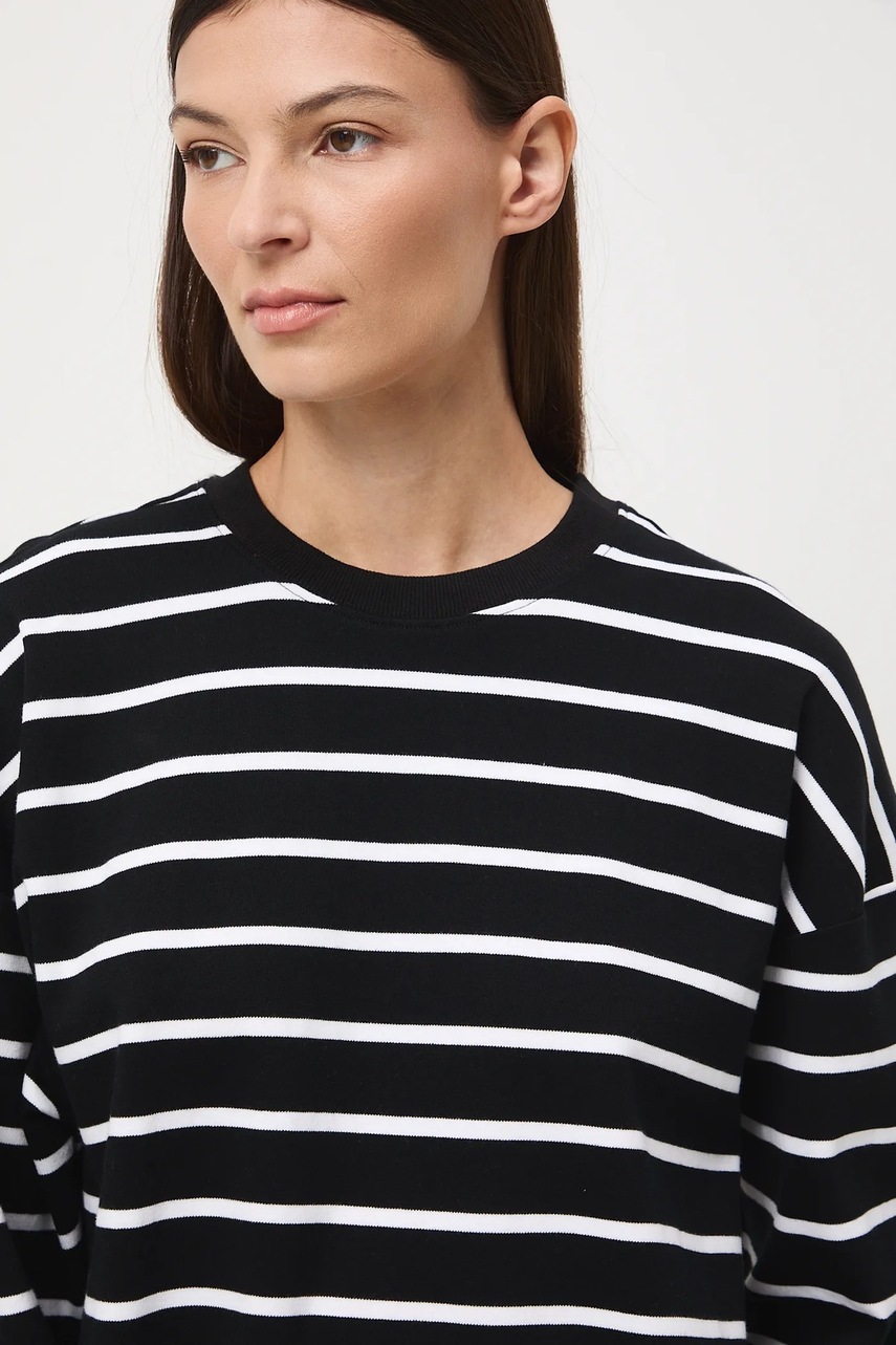 Крій oversize. - Довгий рукав. - Занижена лінія плечей. - Круглий, ребристий вирз. - Рукава зі стяжкою. - Бавовняний трикотаж interlock зі щільним переплетенням. - Смугастий взерунок.