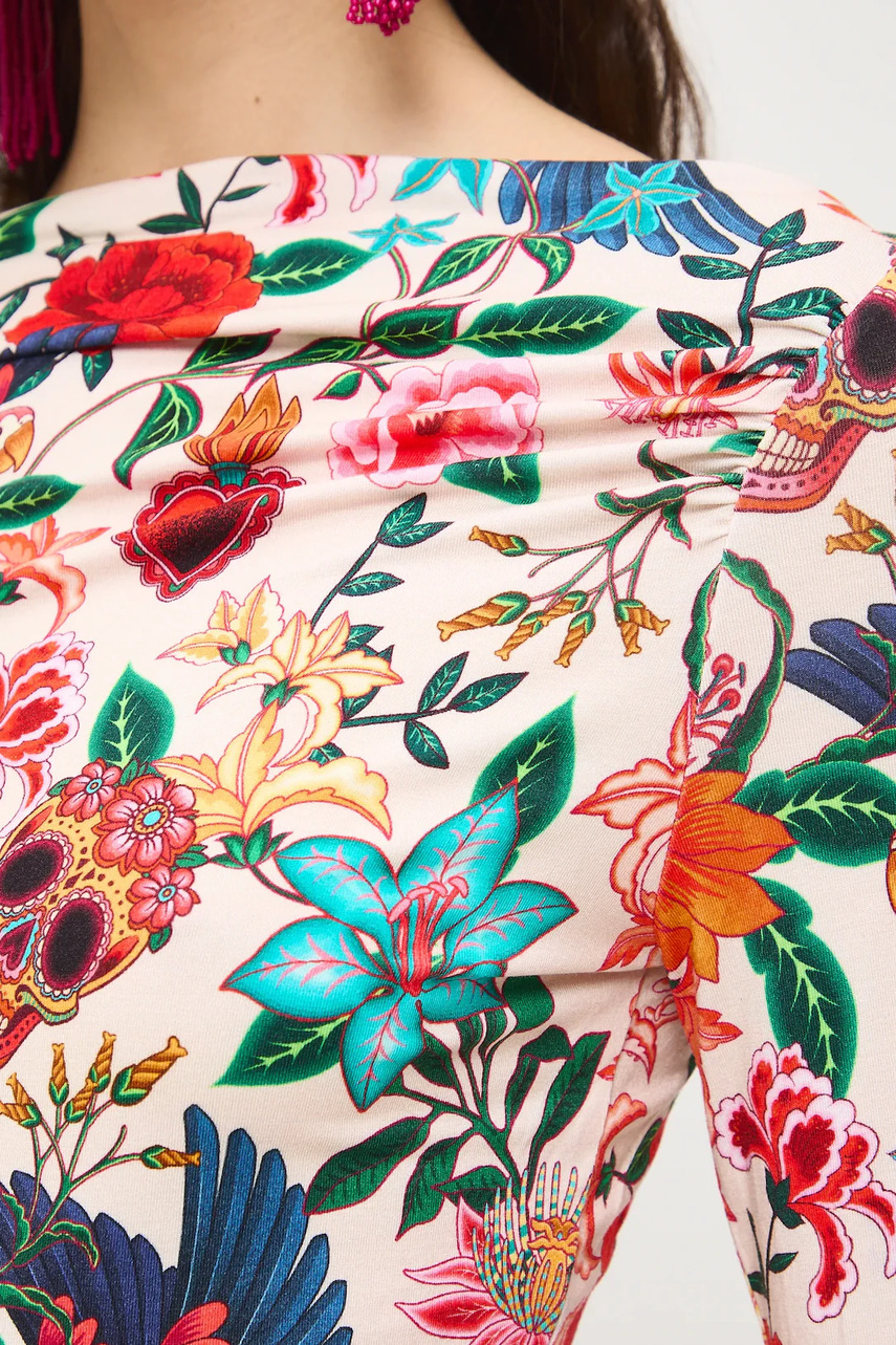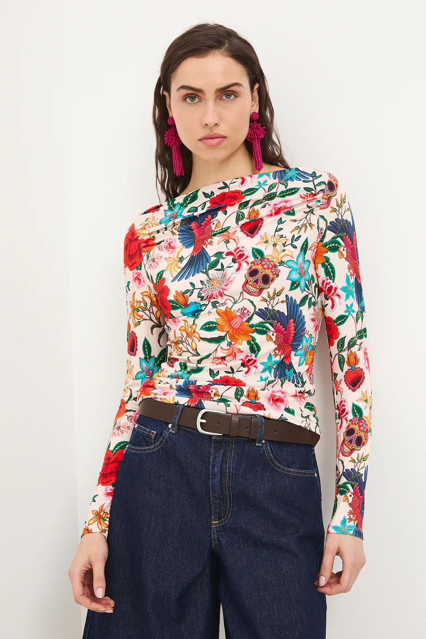 Фасон slim fit. - Довгий рукав. - Виріз-човник. - Декоративна драпіровка. - Візерунок з рослинним мотивом. - Розташування візерунка може відрізнятися на кожному виробі.