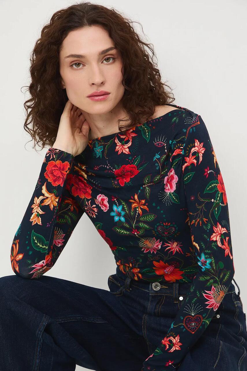 Фасон slim fit. - Довгий рукав. - Виріз-човник. - Декоративна драпіровка. - Візерунок з рослинним мотивом. - Розташування візерунка може відрізнятися на кожному виробі.