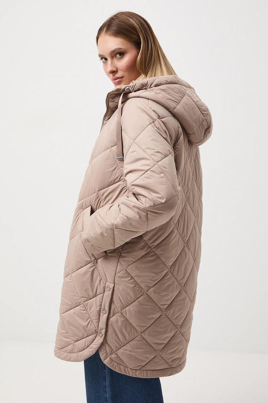 Крій oversize. - Довгий рукав-реглан. - Капюшон зі стягуванням. - Застібається на двосторонню блискавку. - Бічні накладні кишені, що застібаються на кнопки. - Бічні розрізи застібаються на кнопки. - Легко утеплена модель на підкладці.