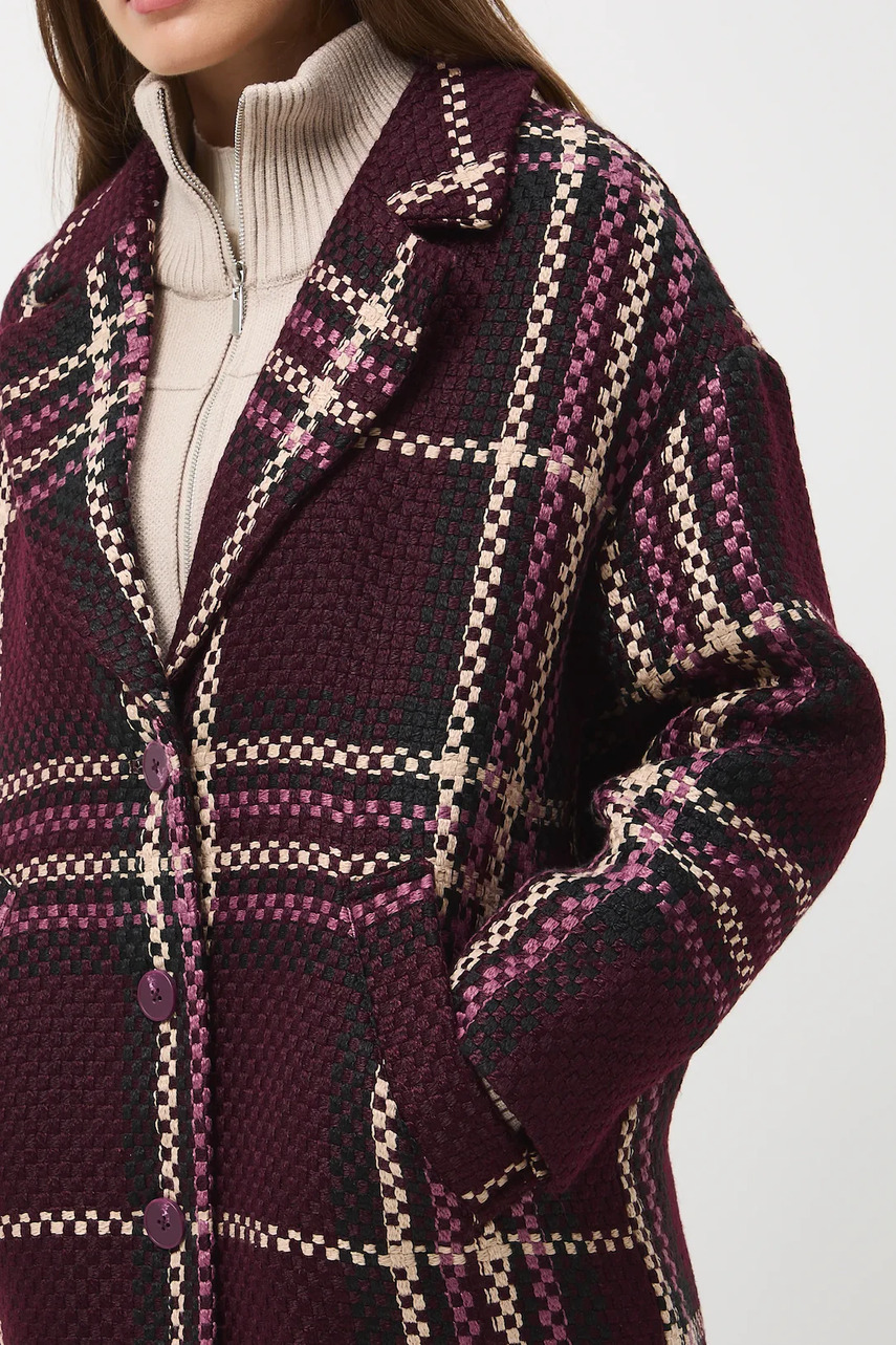 Крій oversize. - Довгий рукав. - Занижена лінія плечей. - Однобортна застібка на ґудзики. - Класичні лацкани. - Дві прорізні бічні кишені. - Розріз ззаду. - Модель без утеплення з підкладкою. - Картатий візерунок.