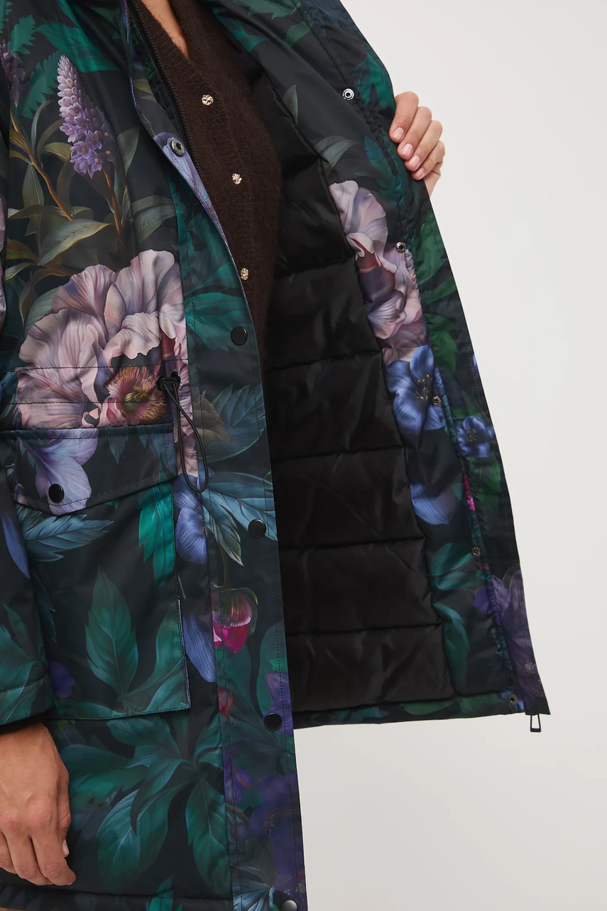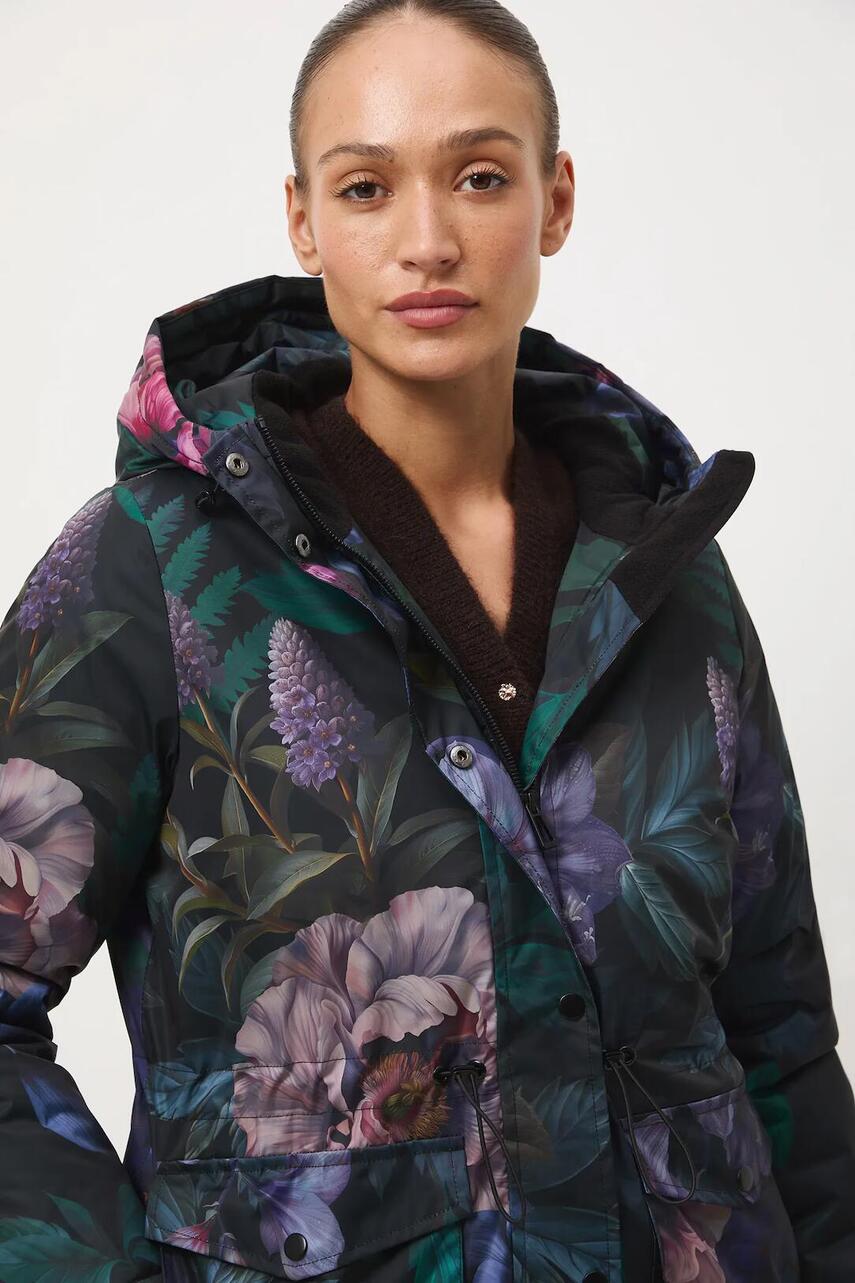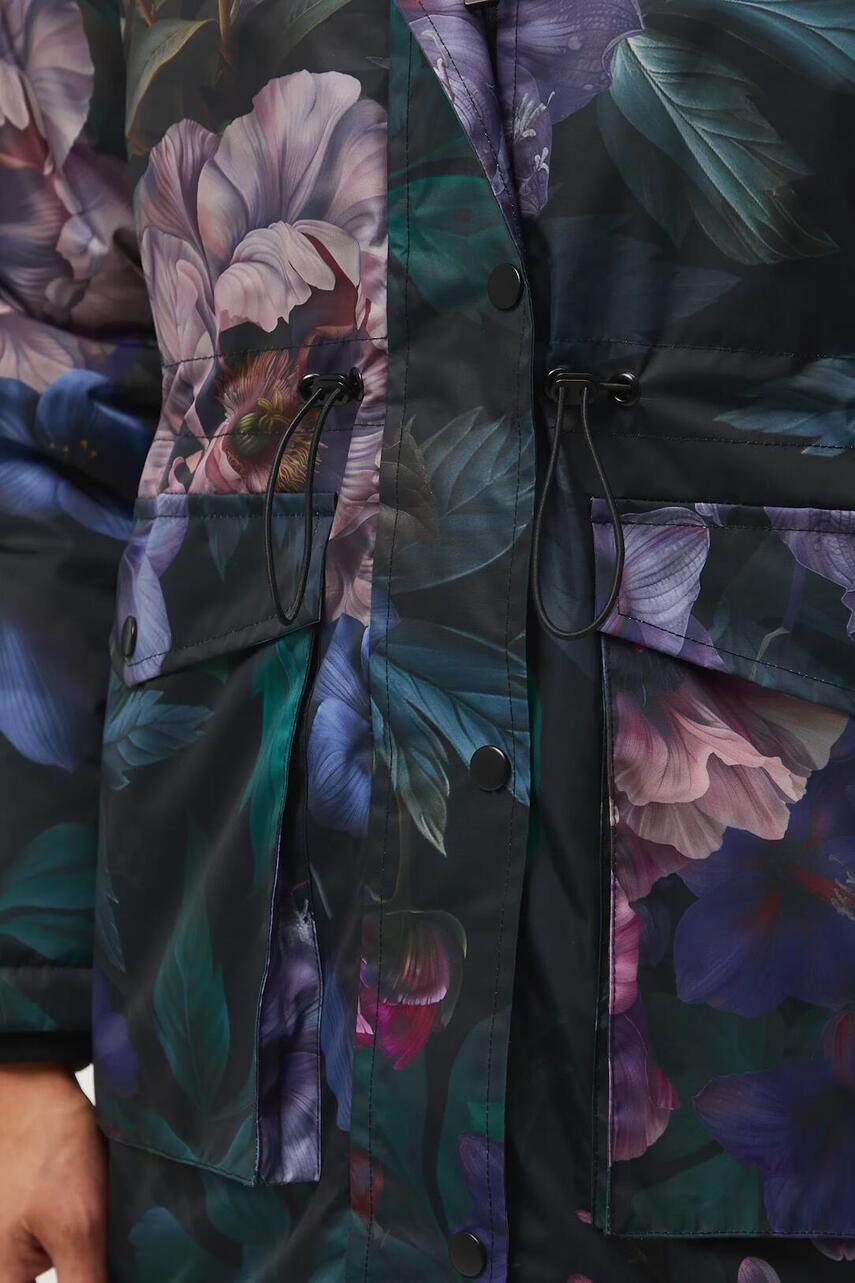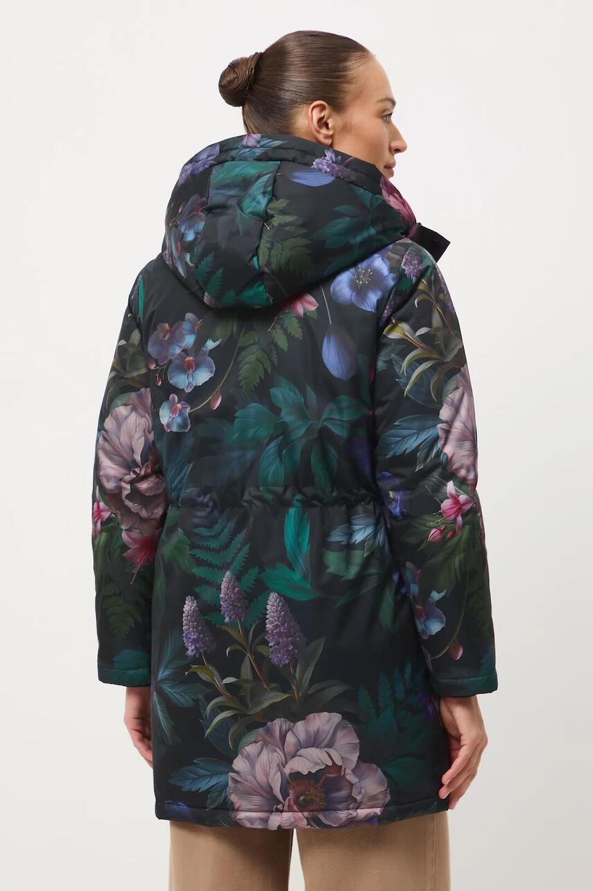 Крій oversize. - Довгий рукав. - Застібка на блискавку і кнопки. - Капюшон затягується шнурками зі стопорами. - Ширина поясу регулюється за допомогою шнурків зі стопорами. - Дві бічні кишені на застібках. - Утеплена модель з підкладкою. - Візерунок з рослинним мотивом.