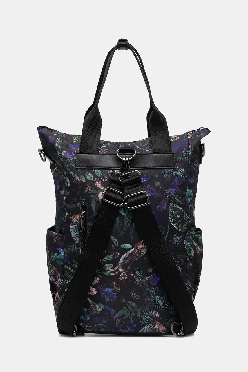 Залежно від того, як застібаються ремінці, модель можна носити трьома способами: в руці, на плечі або на спині. - Застібається на блискавку. - Спереду кишеня на блискавці. - Внутрішня кишеня на блискавці. - Врізні внутрішні кишені. - Дві прорізні бічні кишені. - Ззаду кишеня на блискавці. - Короткі ручки. - Має два знімних регульованих ремінця. - Модель з підкладкою. - Візерунок з рослинним мотивом. - Розрахована на формат А4.