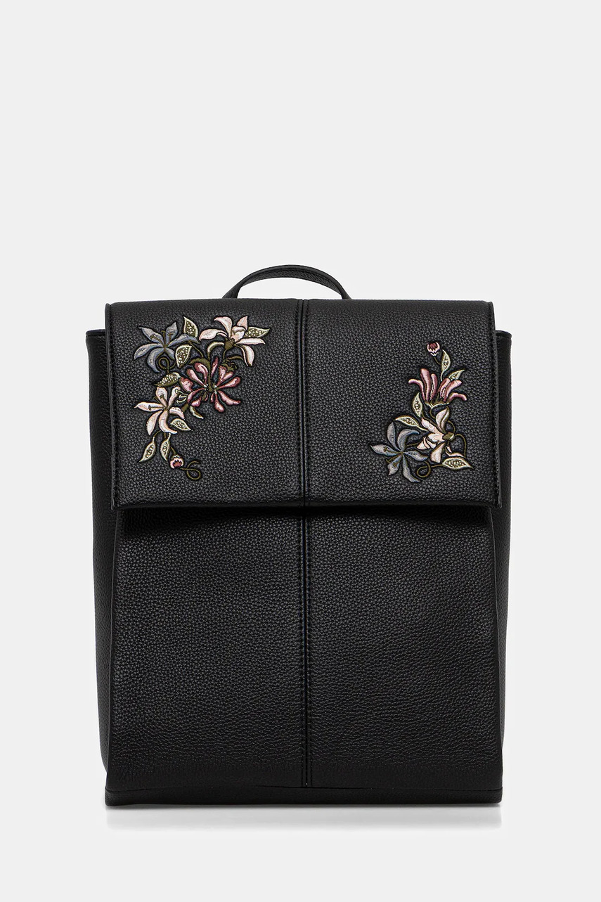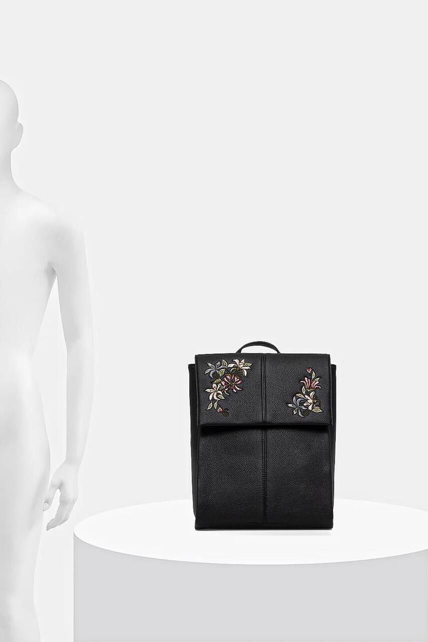 Коротка ручка. - Регульовані, незнімні лямки. - Відділення застібається на магніт. - Застібається на блискавку. - Внутрішня кишеня на блискавці. - Прорізна внутрішня кишеня. - Модель з підкладкою. - Модель з декоративною вишивкою з квітковим мотивом. - Не розрахована на формат А4.
