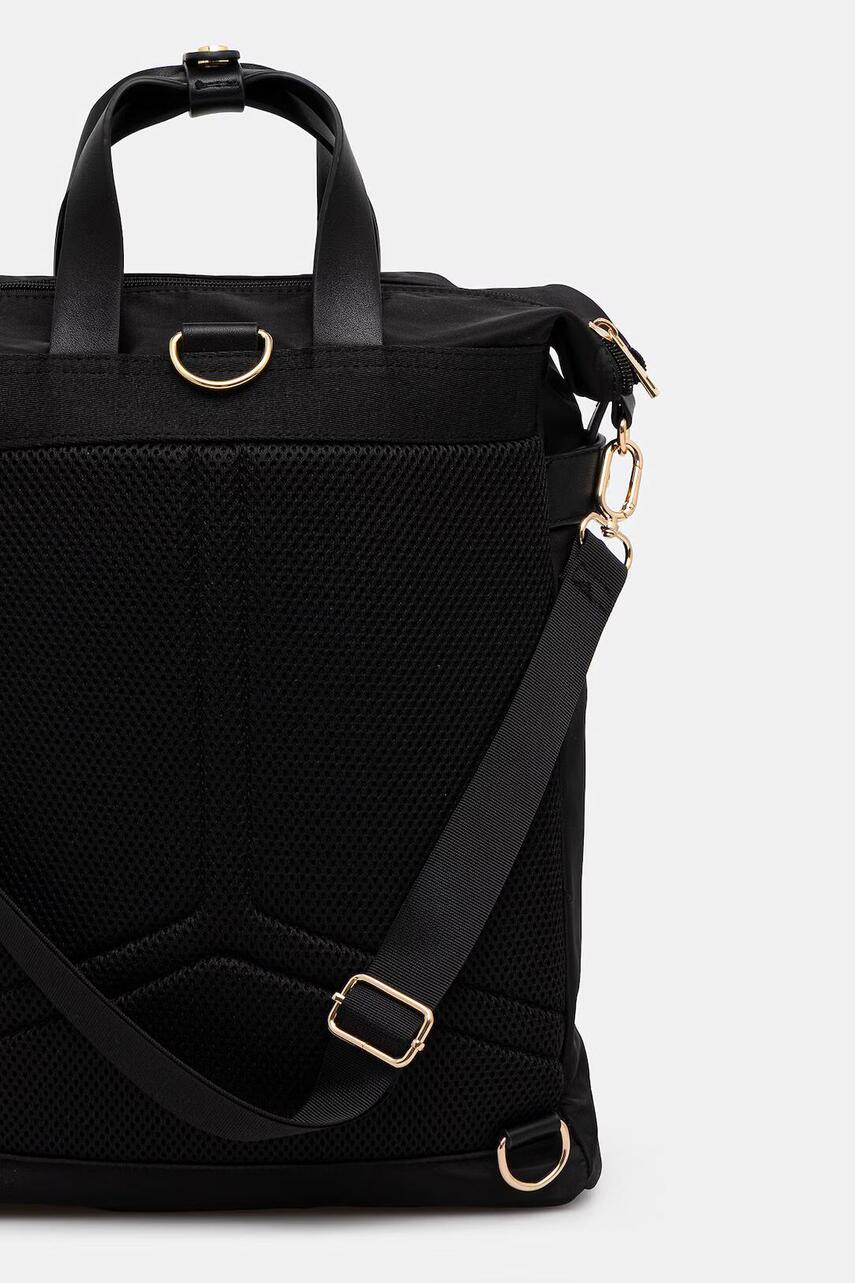 Модель з трьома відділеннями. - Застібається на блискавку. - Основне відділення з двома внутрішніми відкритими кишенями. - Має окреме відділення на липучці для ноутбука або планшета. - Дихаюча сітка на спинці для вентиляції та комфорту під час використання. - Практичні бічні кнопки для регулювання об'єму. - Дві короткі ручки. - Регульована довжина ремінців. - Модель з підкладкою. - Розрахована на формат А4. - Візерунок з рослинним мотивом.