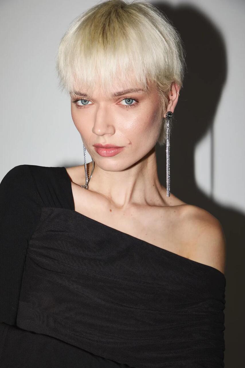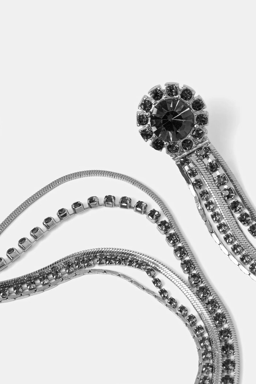 Сережки з колекції Medicine. Модель з декоративними ланцюжками виготовлена з поєднання металів, скла та нержавіючої сталі.