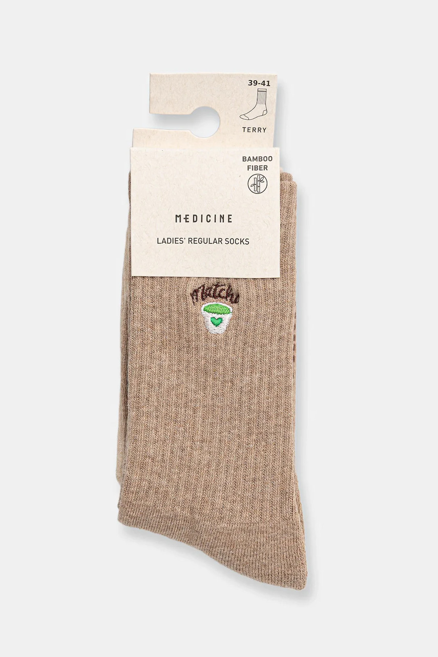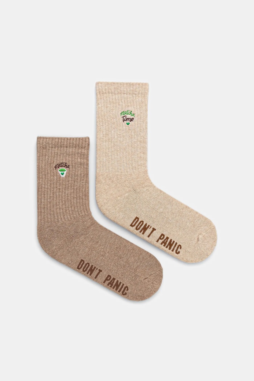 Кількість пар у наборі: 2. - Модель з декоративною вишивкою. - Модель з написом: matcha time. - Меланжевий матеріал.