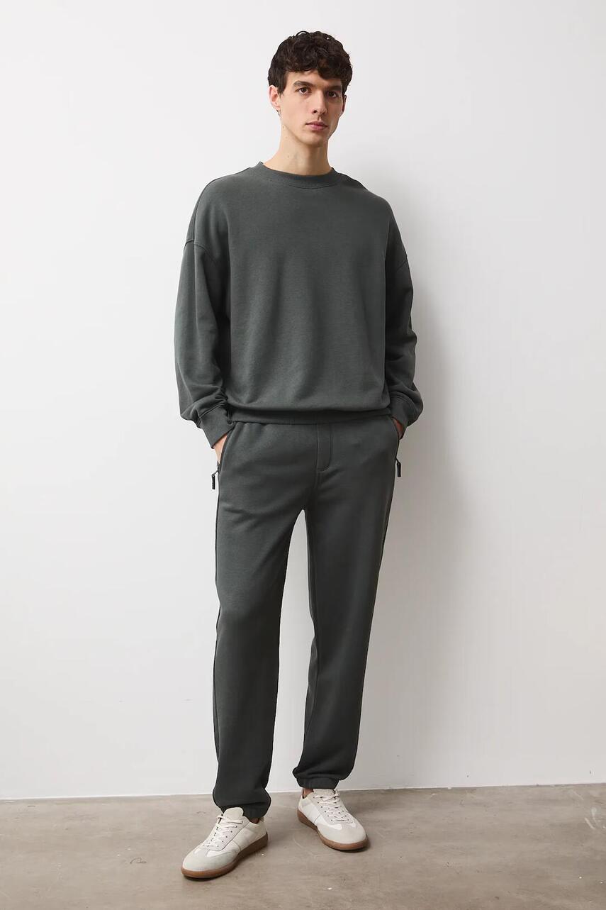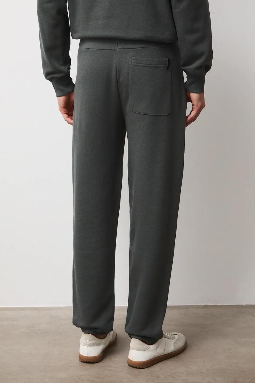 Фасон jogger. - Талія regular. - На талії гумка зі шнуровкою. - Дві бічні кишені на блискавці. - Накладна кишеня на сідниці. - Штанини оздоблені резинкою. - Декоративні деталі. - Гладкий трикотаж.