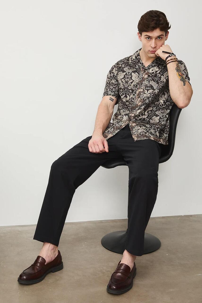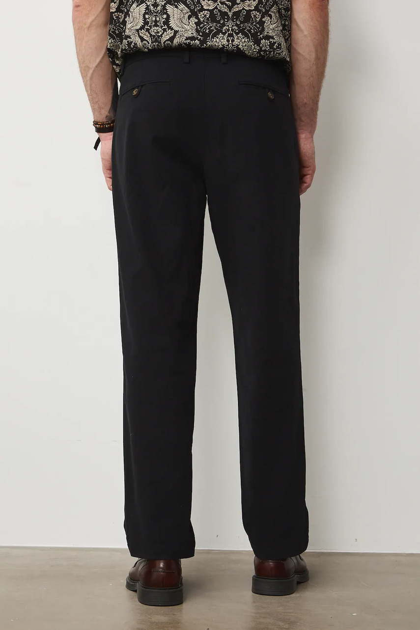 Крій regular. - Для штанів характерні косі кишені - вони ідеально вписуються в стиль smart casual. - Модель із регулярною талією та застібкою на ґудзики і блискавку. - Дві кишені на ґудзиках на сідницях. - Декоративна підшивка. - Тканина з саржевим переплетенням. - Гладка тканина.