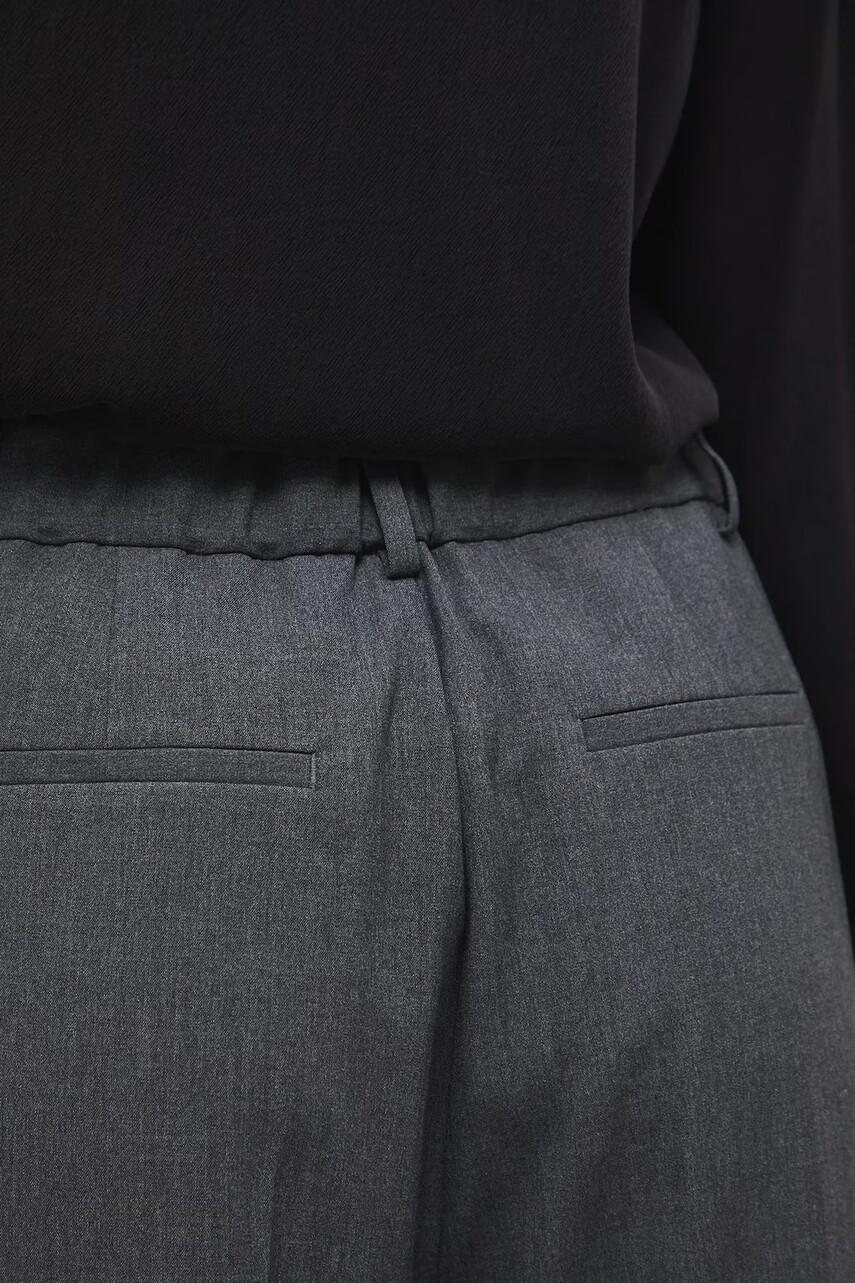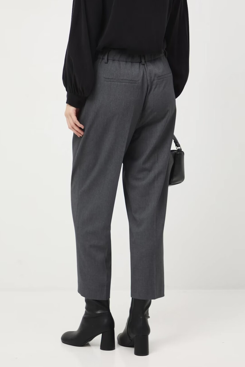 Фасон slouchy. - Модель із регулярною талією та застібкою на блискавку і гачок. - Резинка в поясі. - Дві прорізні бічні кишені. - Декоративна підшивка. - Штанини з кантом. - Укорочені штанини. - Меланжева тканина.