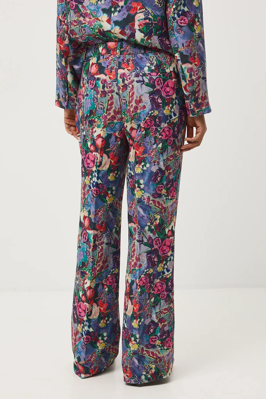 Фасон: wide leg. - Модель із регулярною талією та застібкою на блискавку і гачок. - Дві прорізні бічні кишені. - Широка штанина. - Штанини з кантом. - Візерунок з рослинним мотивом.