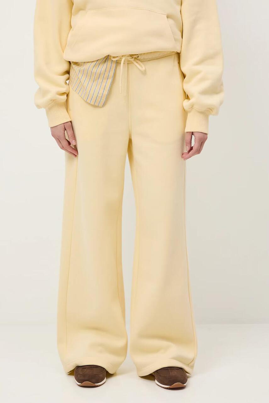 Фасон: wide leg. - Талія regular. - На талії гумка зі шнуровкою. - Прорізні кишені. - Широка штанина. - Гладкий трикотаж.