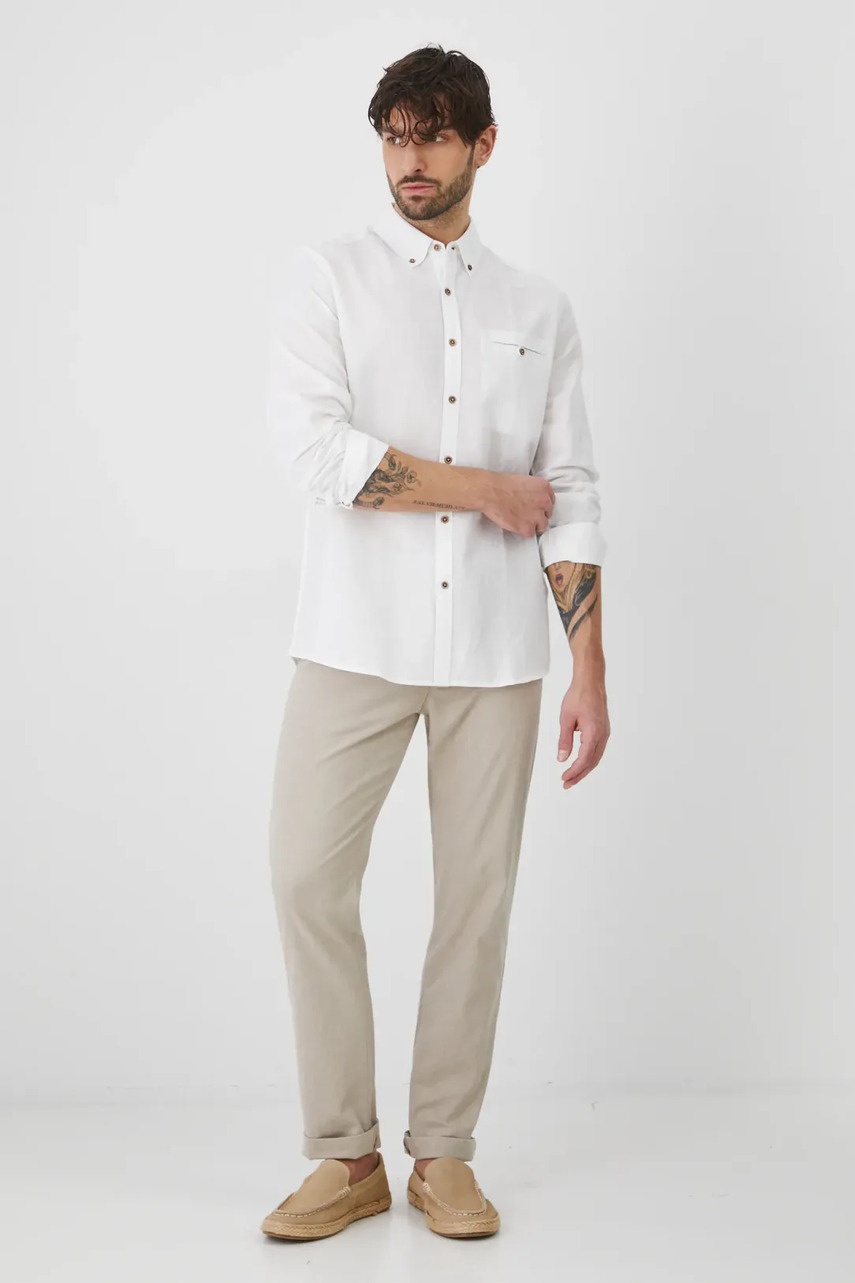 Сорочка фасону regular делікатно прилягає до фігури, але занадто її не підкреслює, забезпечуючи свободу рухів. - Довгий рукав. - Манжети на ґудзиках. - Комірець button-down. - Застібається на гудзики. - Нагрудна кишеня із застібкою на ґудзики. - Гладка тканина. - Модель виготовлена з поєднання льону та бавовни. - Матеріал з льоном забезпечує комфорт і повітропроникність.