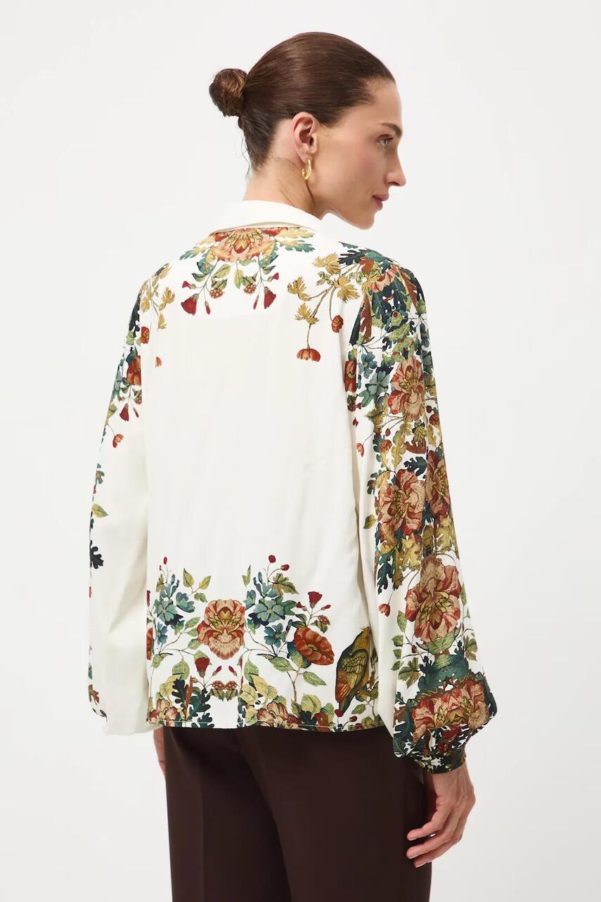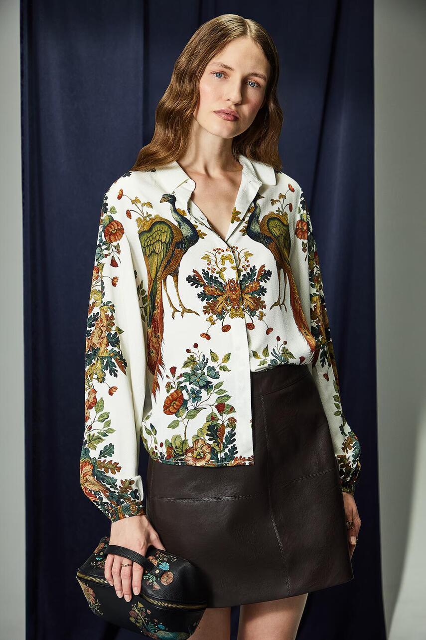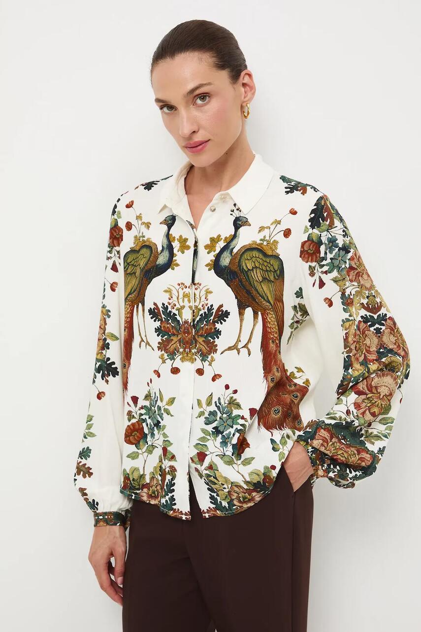 Крій oversize. - Довгий рукав. - Манжети на ґудзиках. - Прихована застібка на гудзики. - Жаккардова тканина. - Дизайн з квітковими та тваринними мотивами. - Розташування візерунка може відрізнятися на кожному виробі.