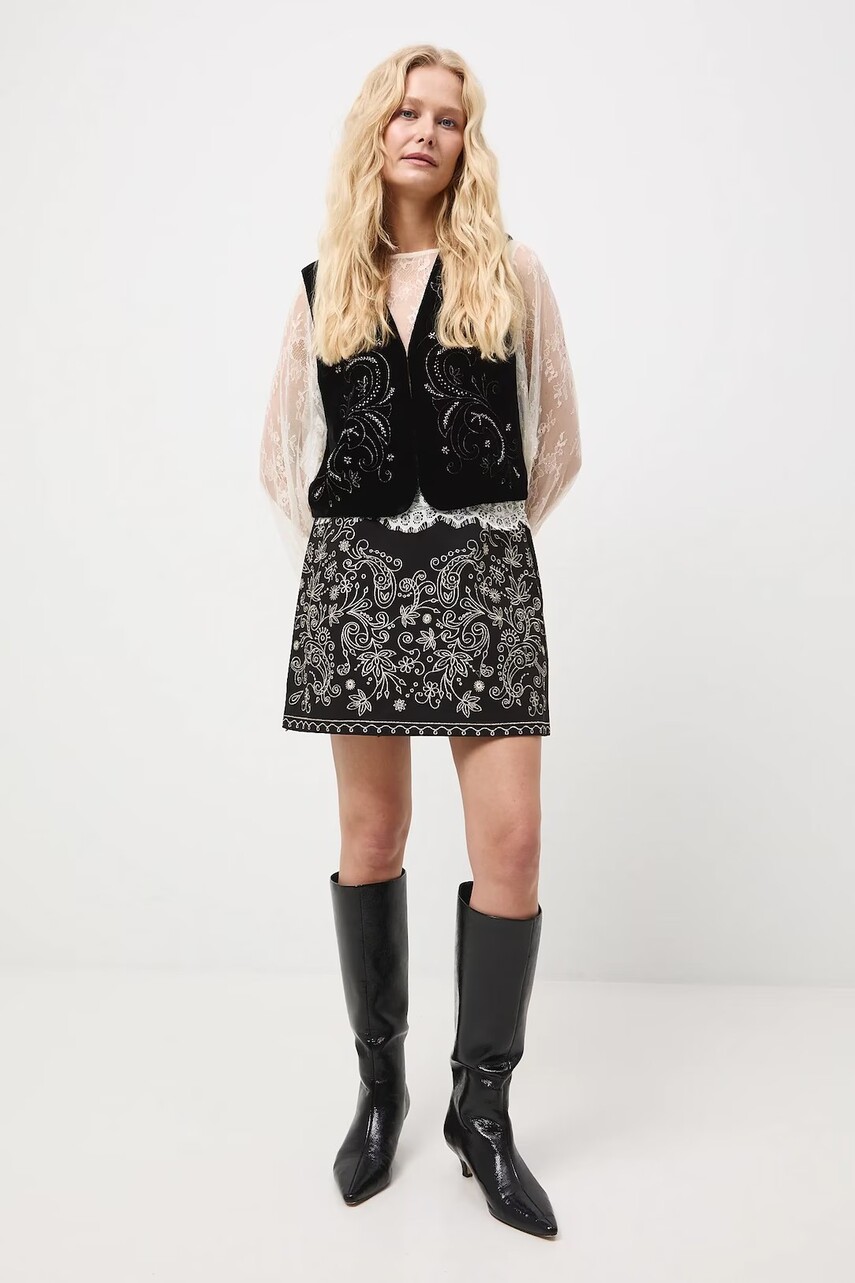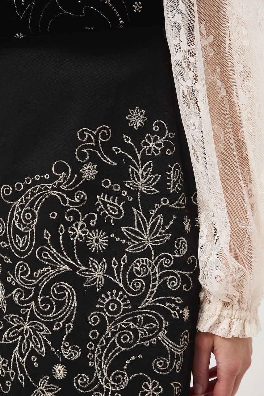 Спідниця з колекції Medicine. Модель прямого фасону, виготовлена з тканини з декоративною вишивкою.