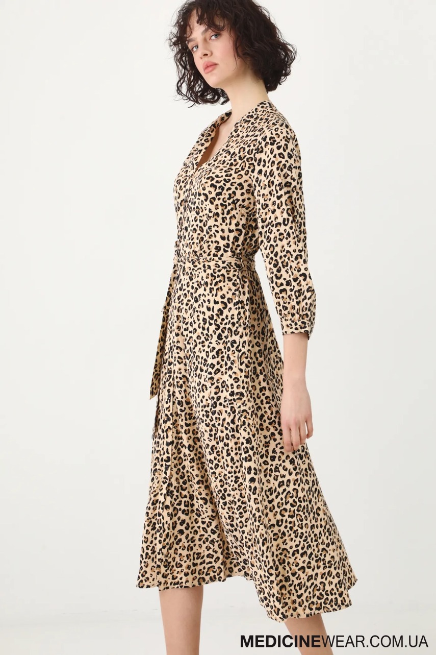 Розкльошений фасон. - Рукав три чверті. - Манжети на ґудзиках. - V-подібний виріз. - Застібається на гудзики. - Додається текстильний ремінь. - Леопардовий візерунок. - Модель довжини міді.