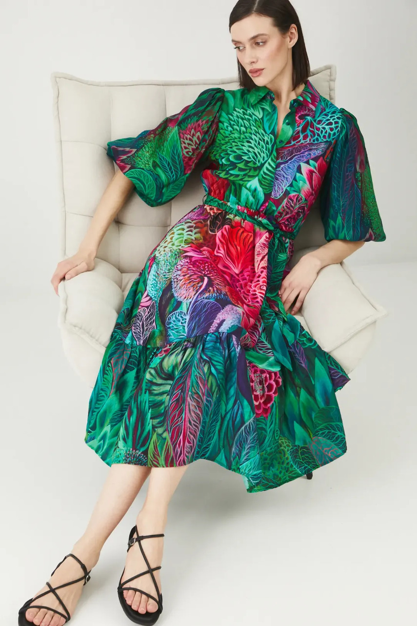 Сукня з колекції зі спеціальної колекції Sense of Values, Justyna Stoszek – Forest Forever for Medicine. Розкльошена модель виконана з принтованої тканини.