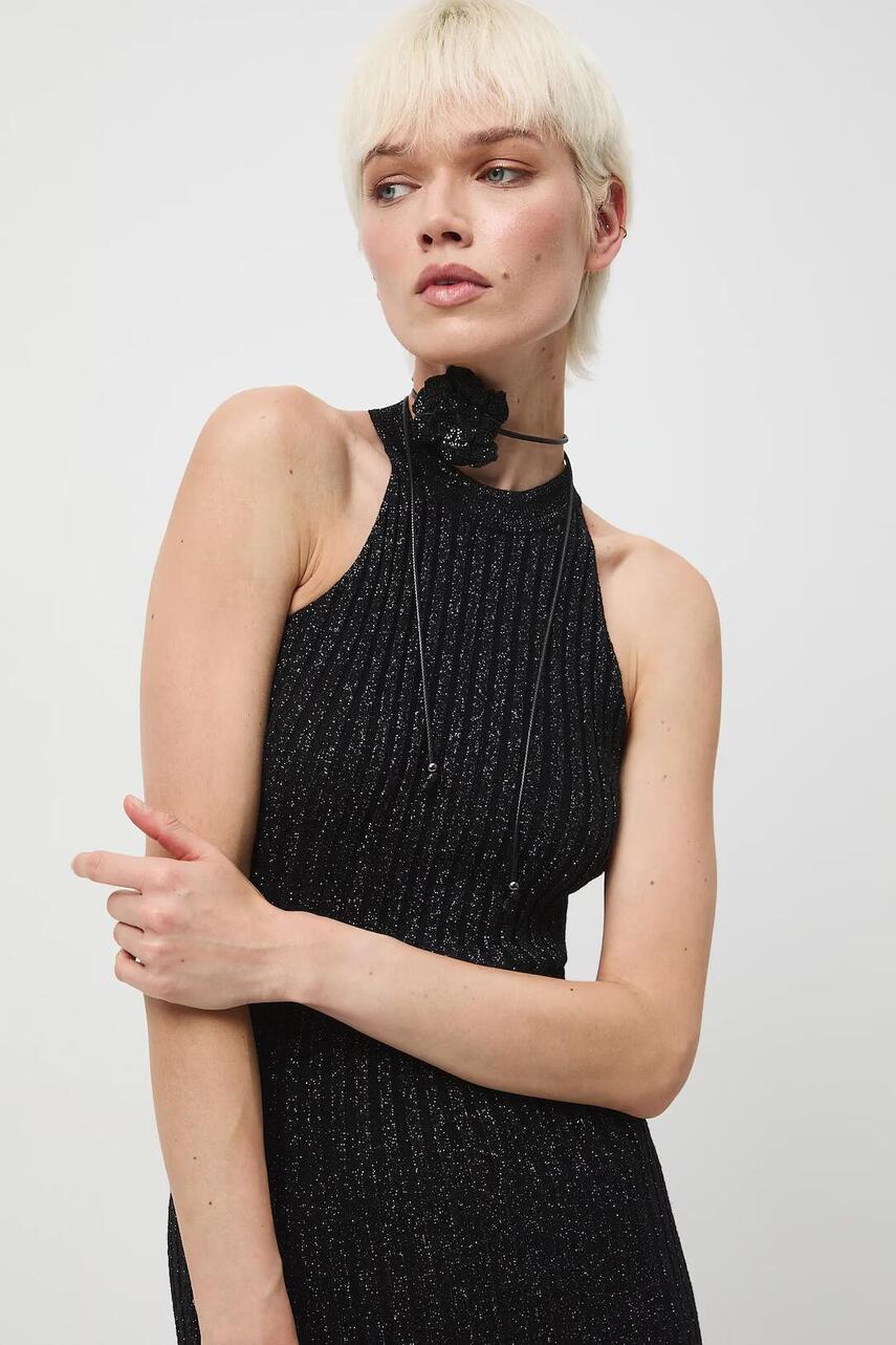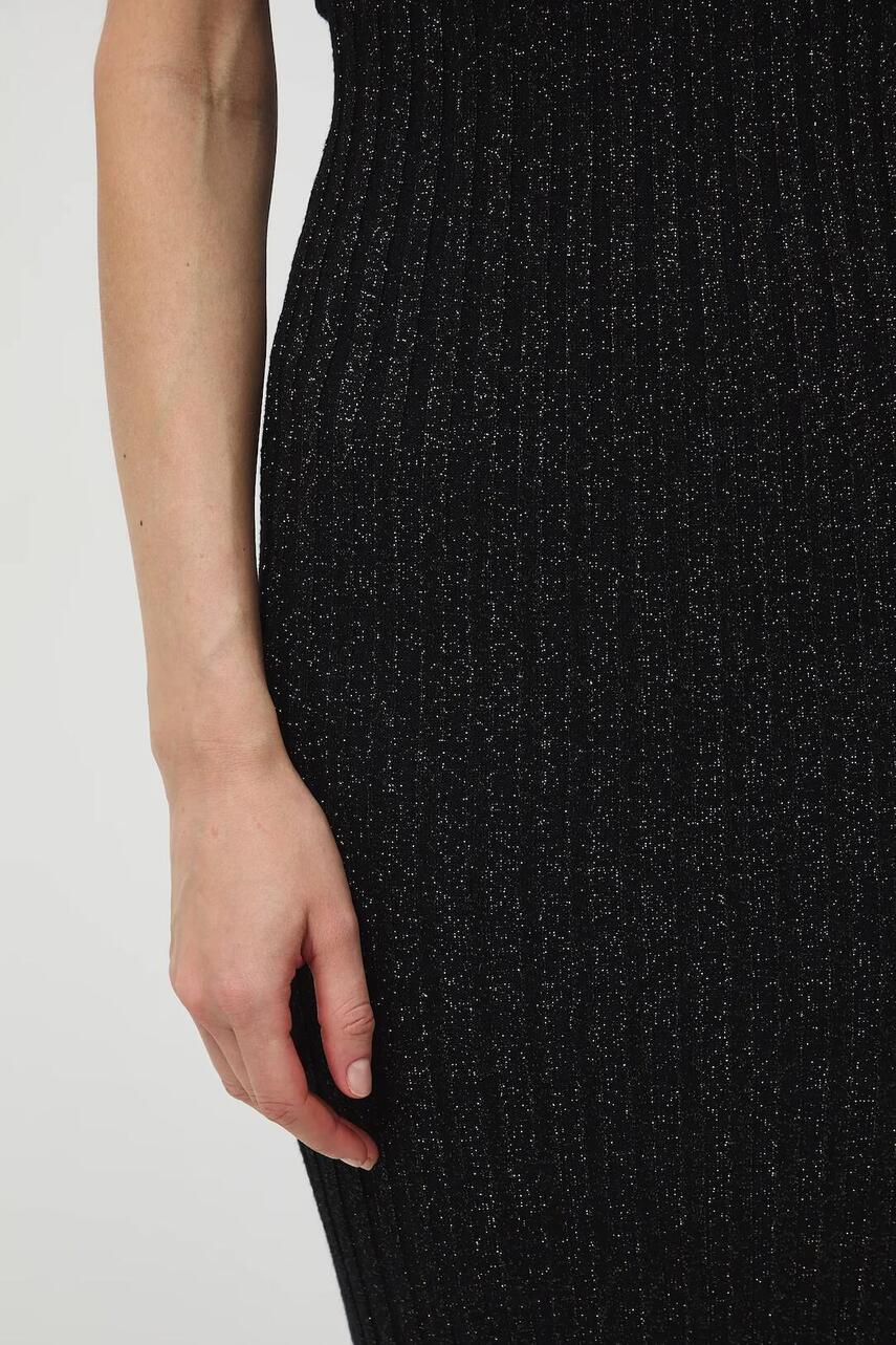 Приталена модель. - Модель без рукавів. - Модель зі стійкою. - Трикотаж в рубчик. - Матеріал з металевою ниткою. - Модель довжини міді.