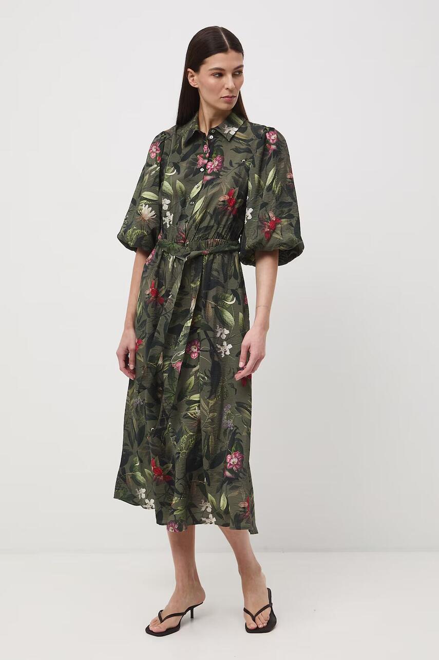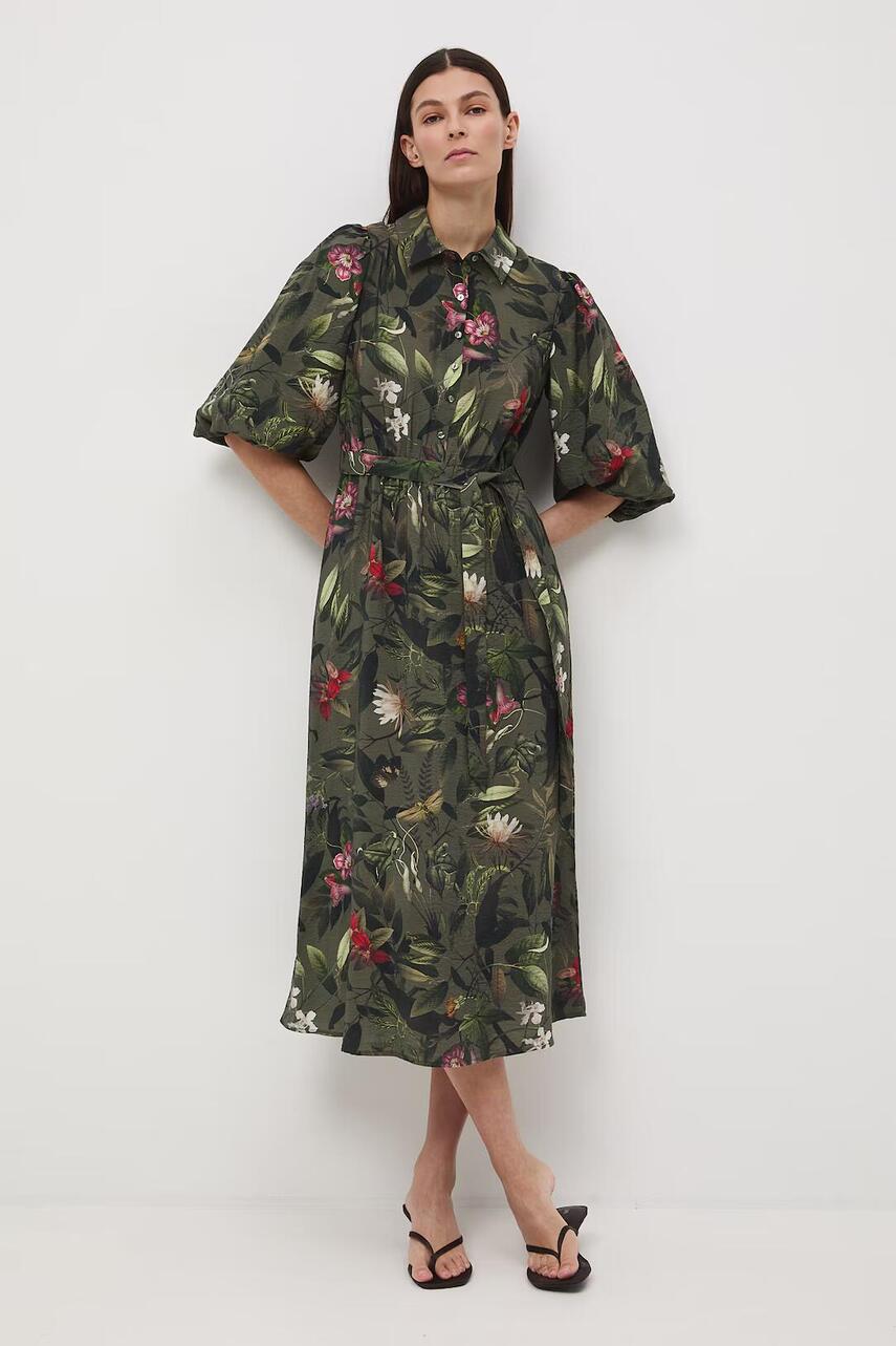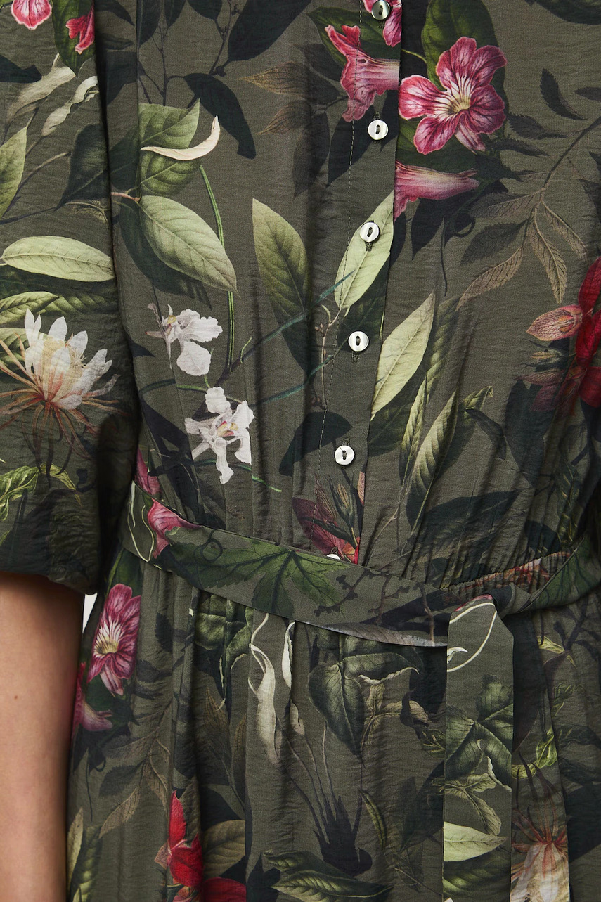 Розкльошений фасон. - Рукав три чверті. - Еластична гумка в талії та текстильний пояс. - Комір. - Коротка застібка на гудзики. - Дві прорізні бічні кишені. - Модель довжини міді.